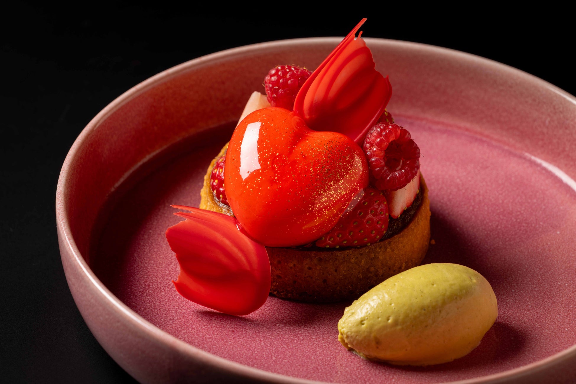 サクサクと香ばしい生地に芳醇な香りと爽やかな酸味のイチゴを合わせたタルトに、ハート形のホワイトチョコレートのムースをあしらい、フレッシュなラズベリーとイチゴをトッピング。