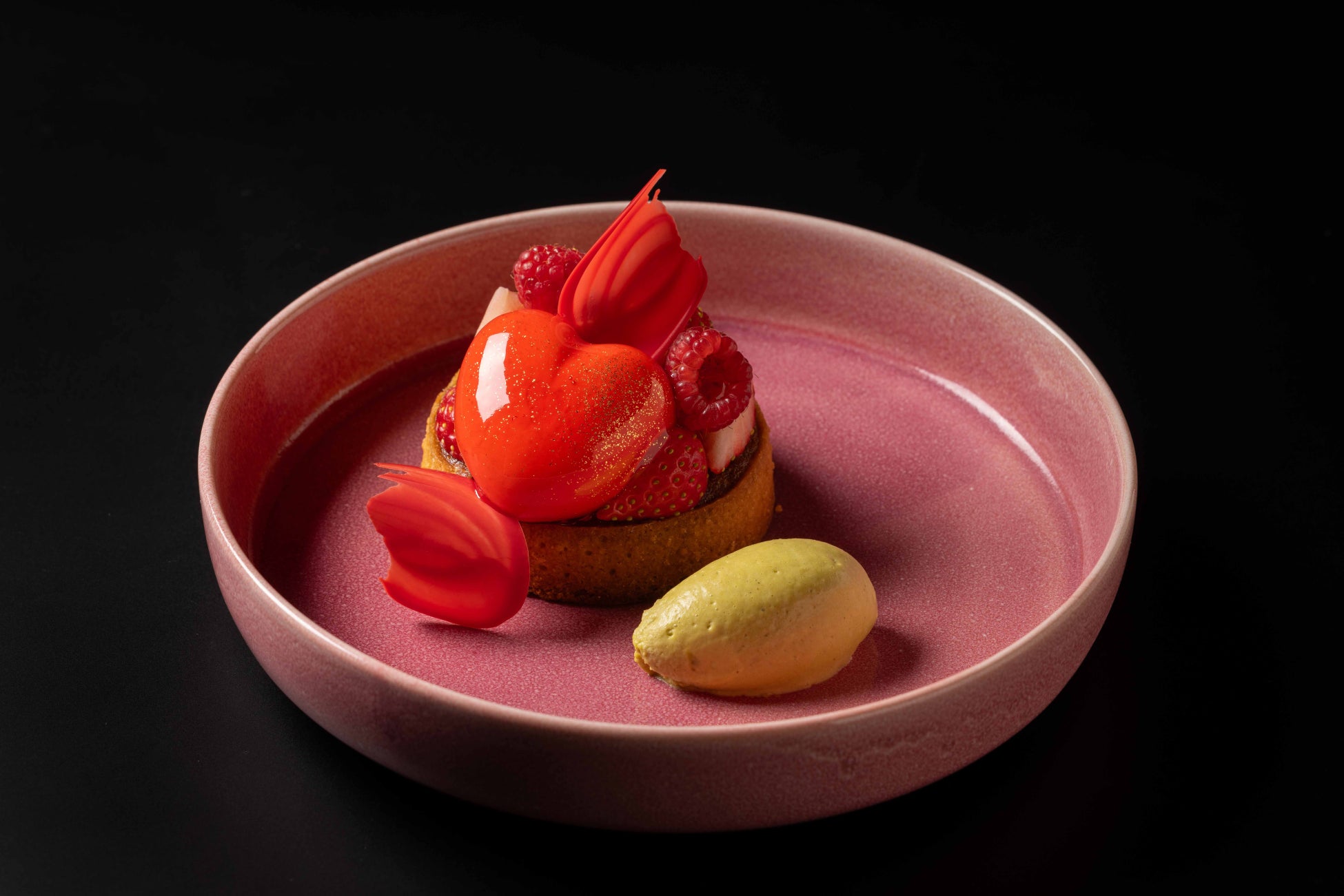 ディナーコースの最後を飾るのは、アラカルトメニューとしてもご用意する、ハートのムースを乗せたストロベリータルトのコースデザートサイズ。「甘いものは別腹」の醍醐味をお届けします。