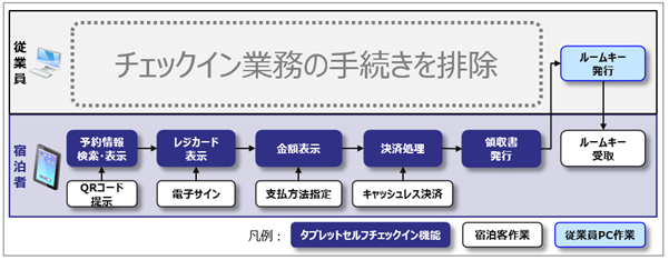 出展製品 ホテルシステム「PREVAIL(プリベイル)」オプション「タブレットセルフチェックイン」概要図