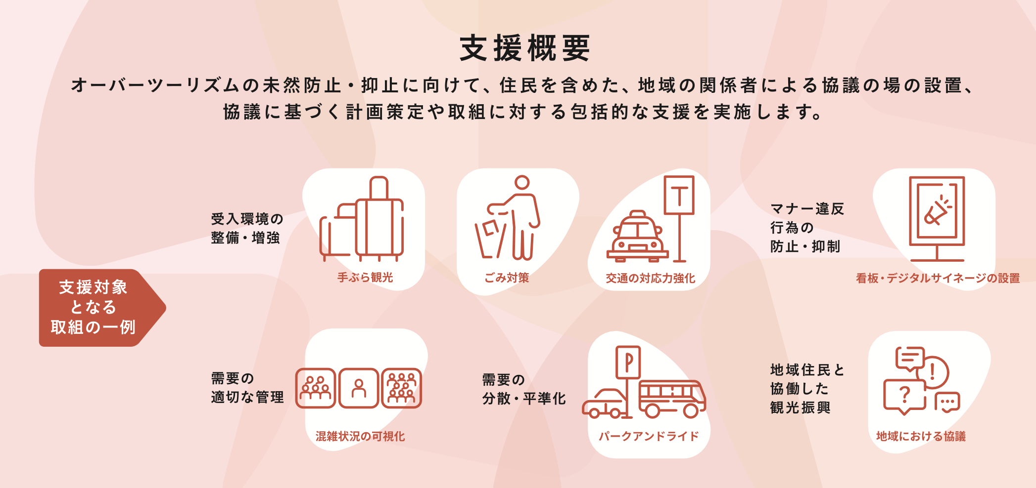 こうした課題に適切に対処し、観光客の受け入れと住民の生活の質の確保を両立しつつ、持続可能な観光地域づくりを実現するためには、地域自身があるべき姿を描いて、地域の実情に応じた具体策を講じることが有効です。本事業は、こうした各地域の取組に対し、総合的な支援を行うことを目的としています。