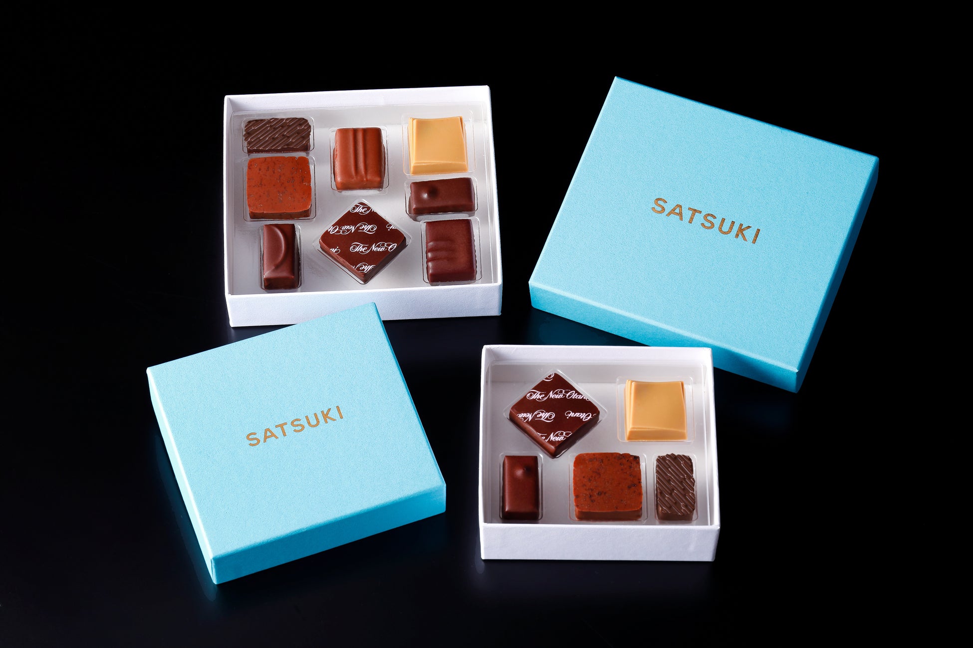 チョコレートが詰まった宝石箱のような3段構えのチョコレートボックス『SATSUKI CHOCOLATE』には、栗の深い香りと味わいが濃厚な″マロン″やいちごの酸味と甘さ広がる″あまおう″などオリジナルフレーバーを含めた5種のチョコレートと、下2段には「アマンド オ レ」や「パール オランジュ ノワール」など「ピエール・エルメ・パリ」の定番人気チョコレート8種を詰め合わせました。