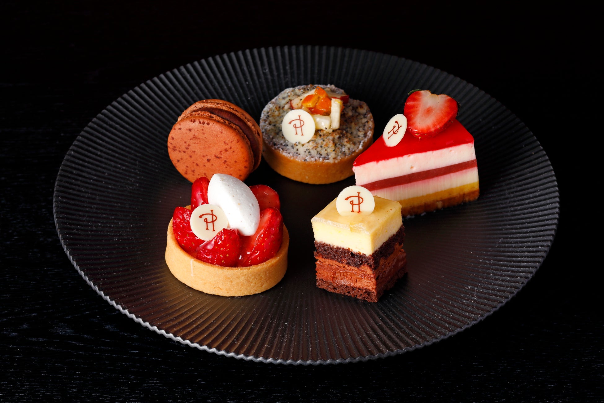 「タルト オ フレーズ」はカラメリゼしたタルト生地に、贅沢にたっぷりとイチゴを、そしてまろやかで極上のマスカルポーネクリームを乗せました。シンプルな構成だからこそ、それぞれの素材の良さが最大限に引き出された期間限定の一品です。「チーズケーキ セレスト」は、さくさくとしたサブレの土台にパッションフルーツ風味のビスキュイがアクセントになり、ベイクドチーズケーキとチーズムースの二層が優しい味わいを奏でるとともに、ルバーブとイチゴの甘酸っぱい香りと味わいをより一層引き立てています。そのほかシグネチャースイーツの「マカロン」や、25周年を機に復刻したクラシックスイーツの1つである「タルト オ ポム ア ロランジュ」など全5種のラインアップでお届けいたします。