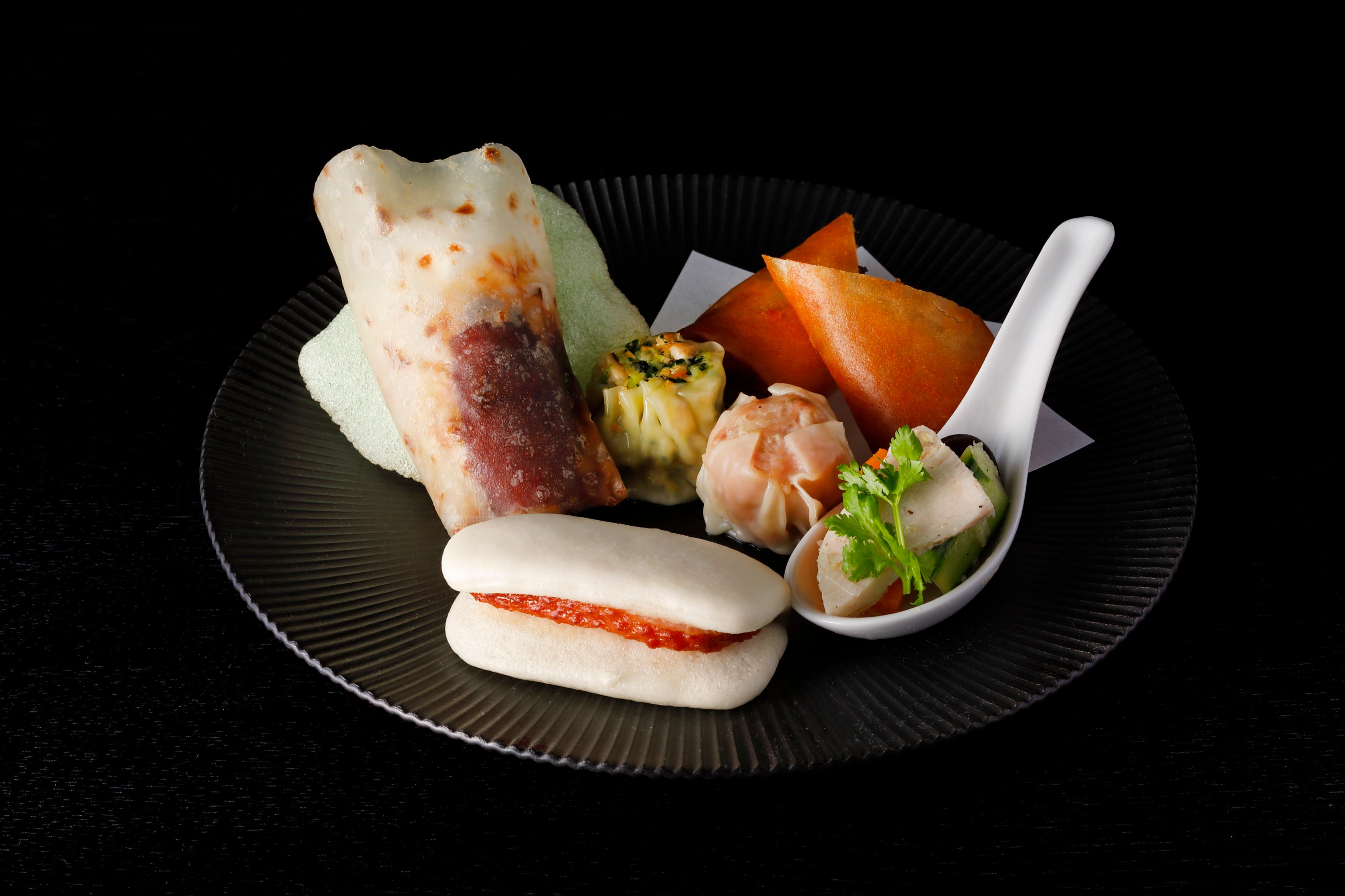(左奥より時計回りに)北京ダック、飲茶二種、ニューオータニ特製春巻き、鶏の和え物山椒風味(2/1~クラゲの冷菜)、スモークダックの蒸しパン包み(2/1~焼豚の蒸しパン包み)