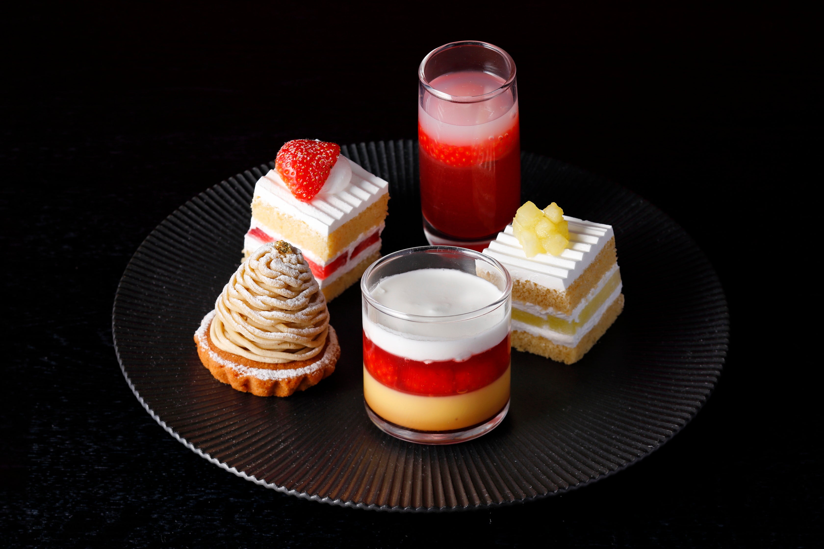 「タルト オ フレーズ」はカラメリゼしたタルト生地に、贅沢にたっぷりとイチゴを、そしてまろやかで極上のマスカルポーネクリームを乗せました。シンプルな構成だからこそ、それぞれの素材の良さが最大限に引き出された期間限定の一品です。「チーズケーキ セレスト」は、さくさくとしたサブレの土台にパッションフルーツ風味のビスキュイがアクセントになり、ベイクドチーズケーキとチーズムースの二層が優しい味わいを奏でるとともに、ルバーブとイチゴの甘酸っぱい香りと味わいをより一層引き立てています。そのほかシグネチャースイーツの「マカロン」や、25周年を機に復刻したクラシックスイーツの1つである「タルト オ ポム ア ロランジュ」など全5種のラインアップでお届けいたします。