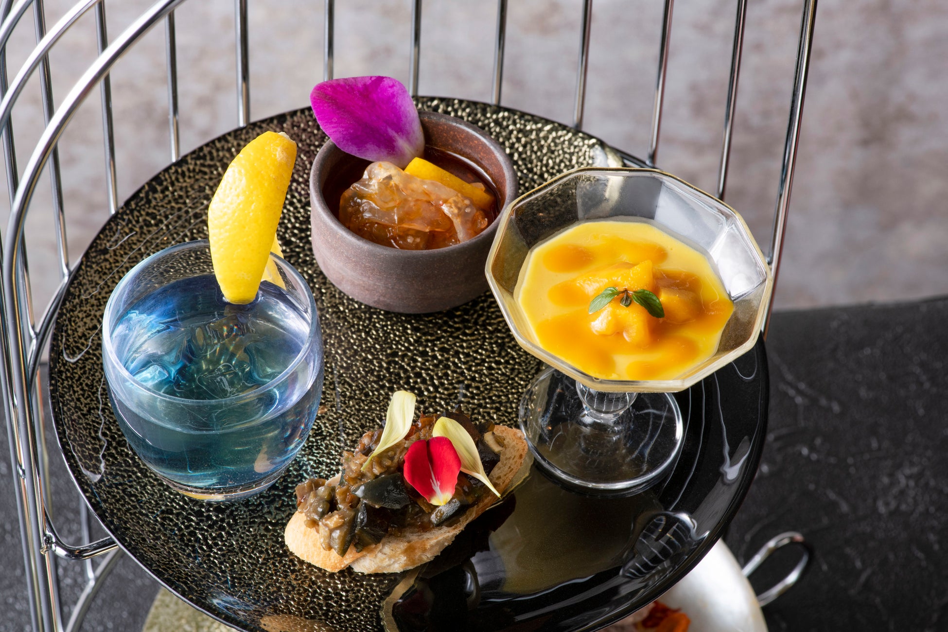 「愛玉子(オーギョーチ)」という植物から作った台湾発祥の愛玉ゼリーをバタフライピーティーに入れて、ドリンク感覚でさらっと食べていただくグラスデザートです。別添えのレモンを絞っていただくと、青色のジュースが徐々に紫色に変化する様子もお楽しみいただけます。