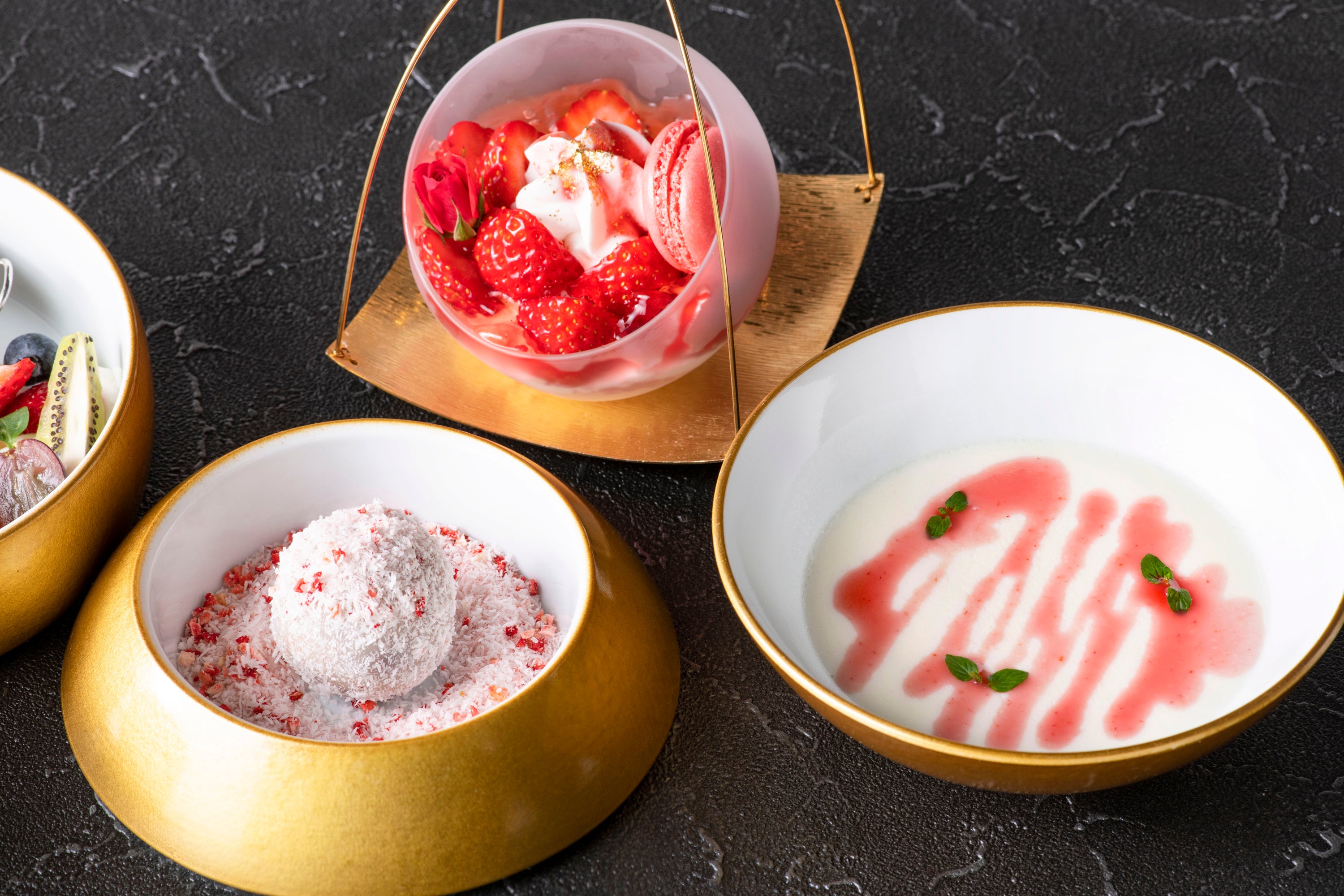 2月1日(木)から4月26日(金)までの期間は、ぷりっとした食感の海老にサクサクのおこげを添えた「海老のチリソースをおこげとともに」や、紹興酒や五香粉で香りづけし、ローズマリーとローストした「ラムチョップのロースト 黒豆と白ワインソース」、帆立にさわやかなライチの香りをまとわせ、キャビアと一緒にお召し上がりいただく「帆立のライチマヨネーズ」、中国国家認定の高級点心師、黄(こう)が手掛けた「和牛のシューマイ」など、こだわりのセイボリーを7種類ご用意しました。スイーツは、「マンゴープリン」や「杏仁豆腐」など「王朝」の人気のメニューに加え、苺をまるごと包み込んだ「苺のココナッツ大福」や、ヒルトン東京ベイのペストリー部門を統括する松下が手掛けた苺をふんだんに使用したパフェ「ストロベリーフロマージュ」もご堪能いただけます。