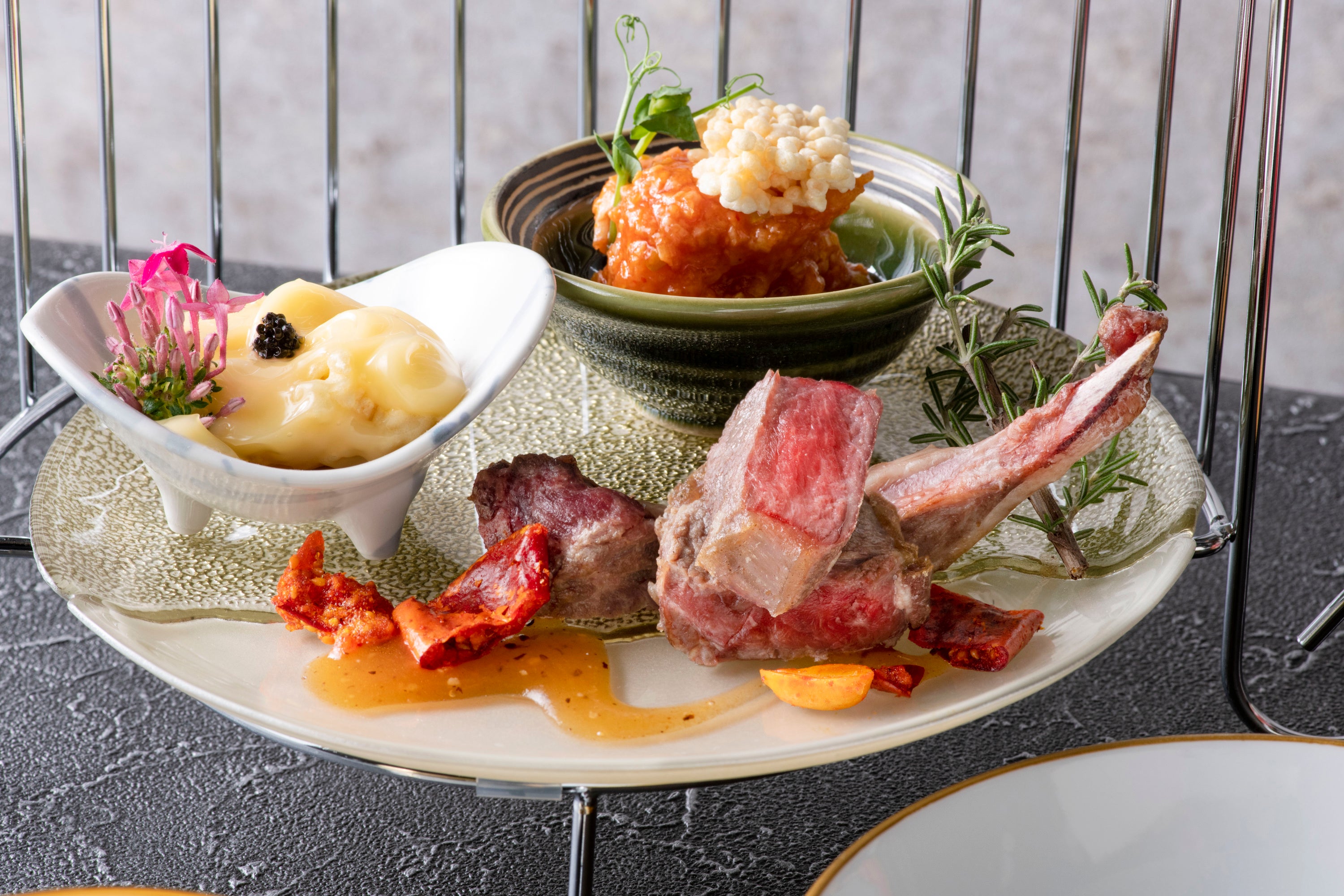 ラムチョップを紹興酒や五香粉、クミンなどで香りづけし、ローズマリーと一緒にオーブンでローストしました。ラム肉に合うよう考案した白ワインと豆豉(トウチ)の特製ソースや、ナッツ香る唐辛子をつけてお召し上がりください。
