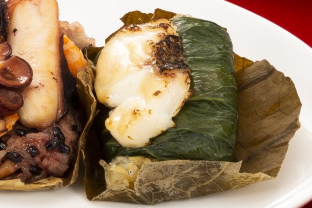 瀬戸内海で水揚げされた天然鯛を「海人の藻塩」でローストしました。鮮やかな緑色広島菜に包まれたもち米には音戸ちりめんを混ぜ込み、さっぱりとした旨みを感じていただける中華ちまきです。