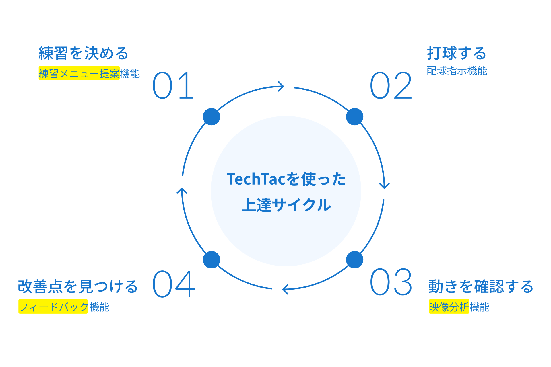 「TechTac(テックタック)」は、練習を決める、打球する、動きを確認する、改善ポイントを見つける、という一連のトレーニングを効果的にサポートする卓球スマートトレーニングシステムです。