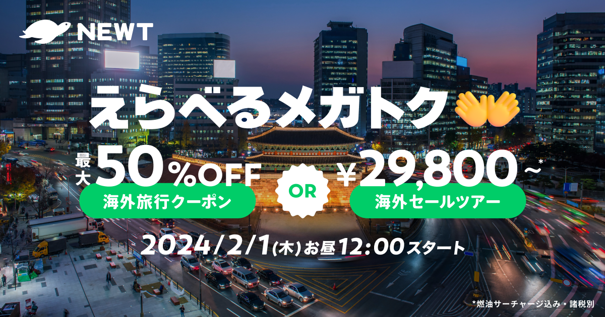 『NEWT』は、海外旅行によって豊かな人生を築くきっかけづくりを支援しています。新しい経験や学び、冒険と挑戦、国際的な視野など、海外旅行に求めるものは人によって異なる中で、それぞれの旅スタイルに合わせた海外旅行を実現して欲しいという思いから、当社では最大50%OFFクーポンかおトクなセールツアーをお選びいただけるえらべるメガトクキャンペーンを実施します。