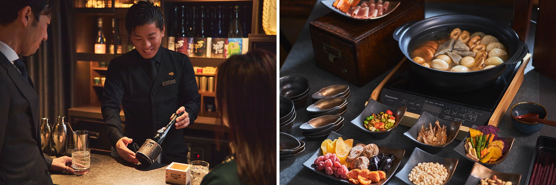 チェックインはホテル1階の吉川醸造直営「酒蔵Bar」にて。日本酒「雨降///あふり」の飲み比べの他、雨降ハイボール、雨降カクテルなど、新たな楽しみ方をご提案。おでんや乾き物を中心とした軽食も、全て宿泊料金に含まれております。