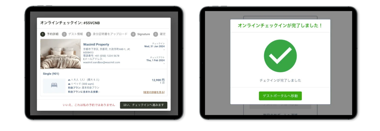 宿泊者が、予約完了後に自動で送られてくるオンラインチェックイン用のURLへアクセスすることにより、チェックイン時にフロントで必要な手続きを事前に済ませることができる機能です。オンラインチェックインの画面では、フロントで必要とされる名前や住所、電話番号、同伴者の名前、住所などの入力や承認のサイン、パスポートなどの身分証のアップロードができるようになっているため、宿泊者は宿泊施設に到着後、スムーズにチェックインをすることができるようになります。