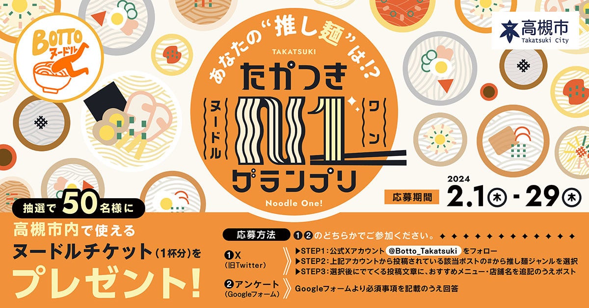 応募はBOTTOたかつき公式X(旧Twitter)またはGoogleフォームから受け付けていて、応募いただいた方から抽選で50人に、対象店舗で使えるヌードル1杯が無料になるチケットをプレゼントします。