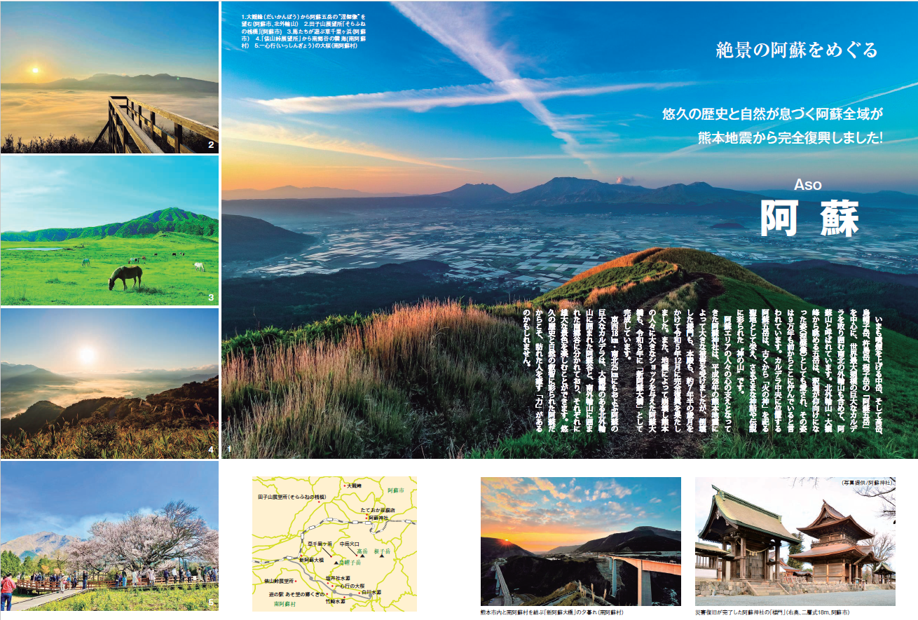創刊号は、特集「春の天草 心ときめく旅へ」・「絶景の阿蘇をめぐる」の他、「九州の花の名所と春のイベント」等をご紹介しており、また半額宿泊券が116名様に当たる宿泊情報も満載です。