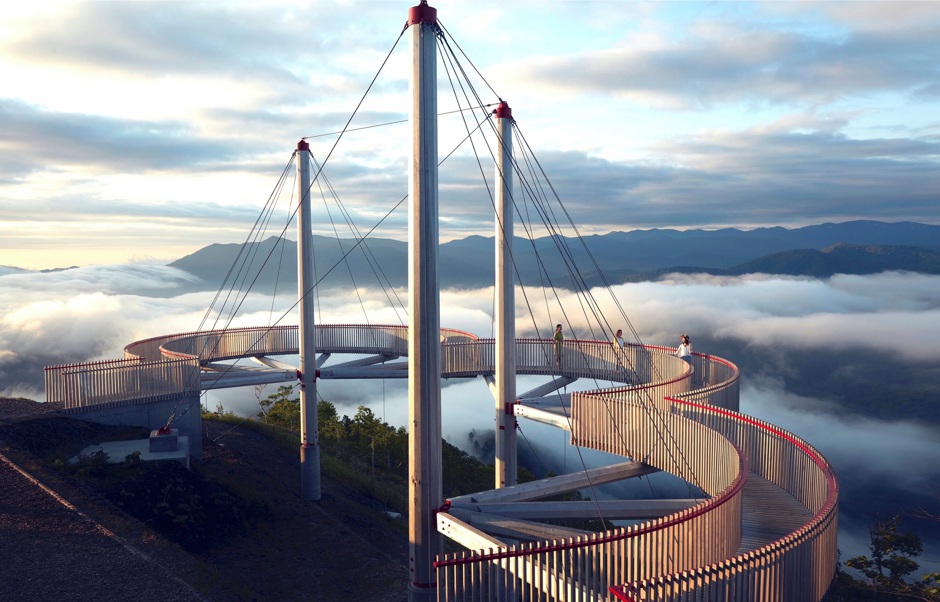 雲海テラスは、トマム山の標高1,088メートルにあり、気象条件がそろった時に流れ込むダイナミックな雲海を間近で観賞する展望施設です。ゴンドラ整備のスタッフにとっては見慣れた風景だった雲海をお客さまにも見てもらいたいという思いから誕生。2006年の開業以来、160万人を超えるお客さまが訪れています。さらに、2021年にはリニューアルオープンし、3階建ての展望デッキから今まで以上に雲海と山々の景色を見渡せるようになりました。雲海ゴンドラに乗って片道約13分でアクセスでき、営業期間中に雲海が発生する確率は約40パーセントです。
