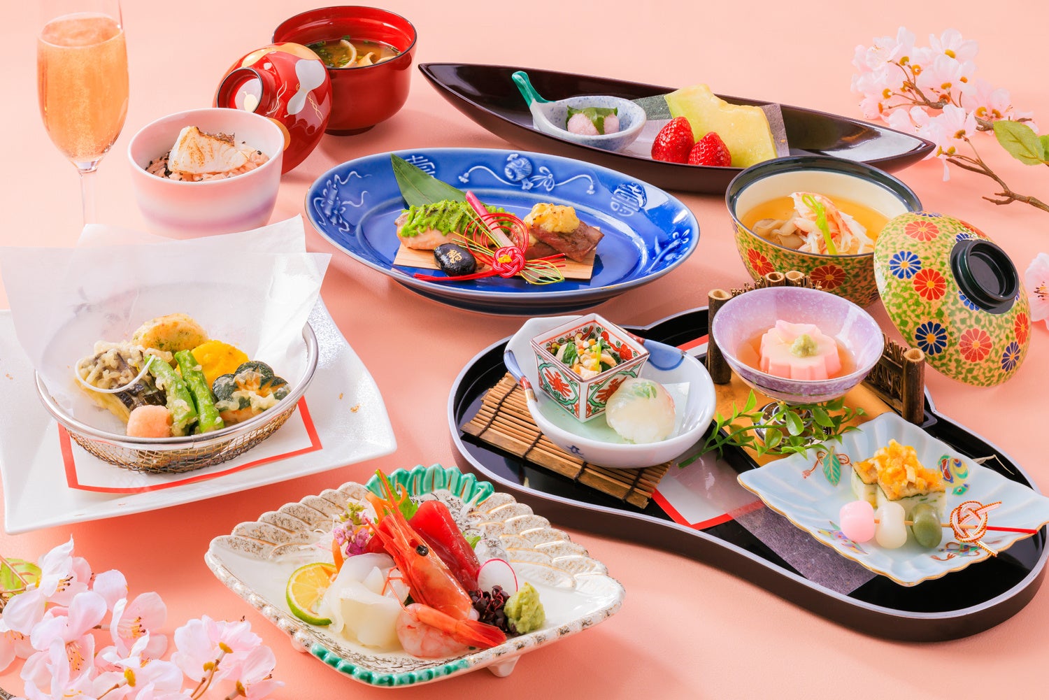 二膳仕立ての「春のお祝い昼御膳」と贅沢な7品からなる「春のお祝い会席」も、桜の花に見立てた桜胡麻豆腐や、菜の花の芽吹きを表現した穴子の菜種焼き、新緑をイメージしたサーモンの若草焼きなど、春を連想させる繊細な品々が随所にちりばめられています。
