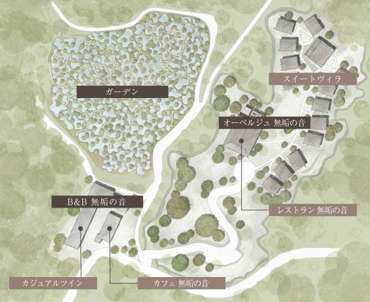 この美しい森は、「オーベルジュ無垢の音」エリア、「B&B無垢の音」エリア、「ガーデン」エリアの3つのエリアで構成されています。敷地のどこにいても、目の前に広がる自然に身をゆだね、時に追われることを忘れるひとときをお過ごしいただけます。散策する、ただただ寛ぐ、食事を愉しむ。何気ない、すべての時間が、無垢なる音に包まれます。