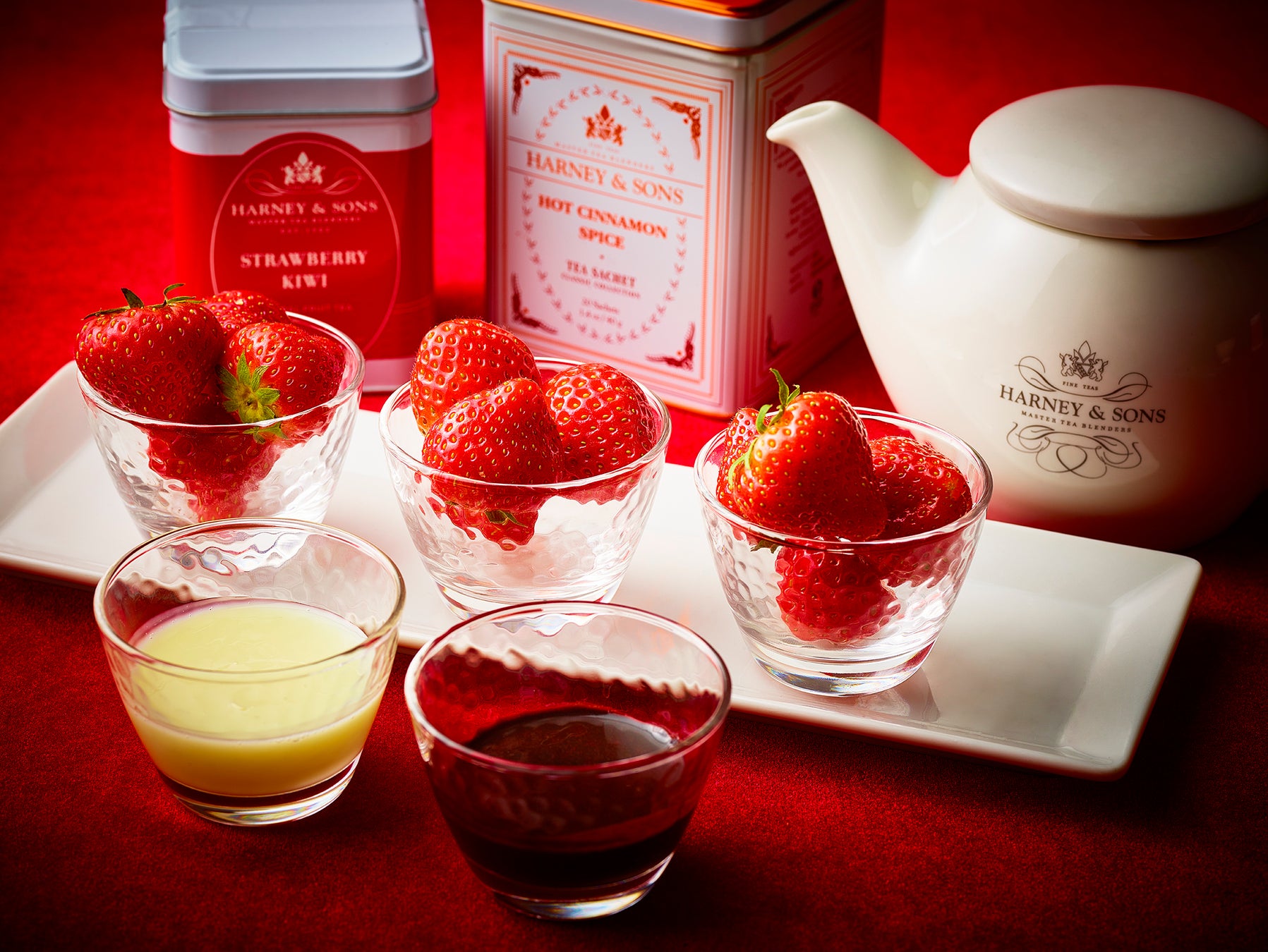 アメリカ ニューヨーク州で誕生した、プレミアムティーブランド「HARNEY & SONS」とのコラボレーションプレート。パティシエが考案した「フレッシュいちごに合うソース」2種と、3種のブランドいちごがセットになったプレミアムプレートです。ソースの1種は、「HARNEY & SONS」の中でも個性的な茶葉「ミルキー・ウーロン」にパティシエ特製「ミルクソース」を合わせ、濃厚なミルクの味わいにフルーティーな茶葉の香りを纏わせた特別なソースに仕上げました。フレッシュいちごに絡めて、リッチな味わいをお愉しみください。