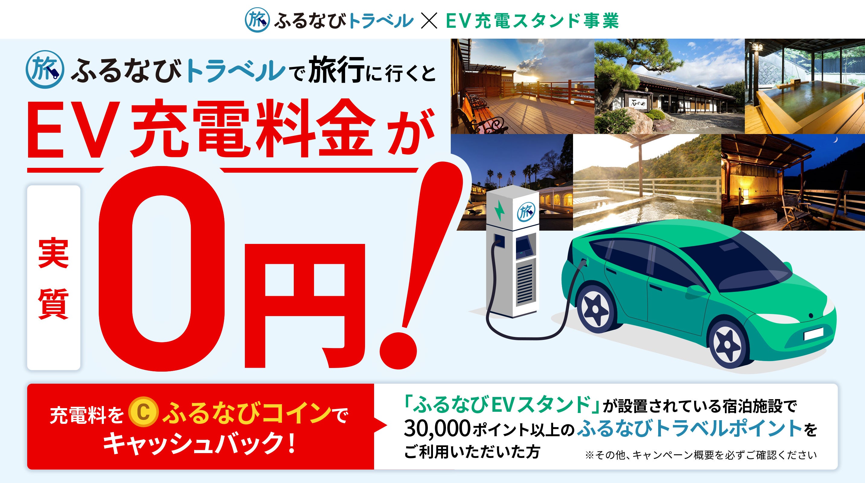 「ふるなびEVスタンド」が設置されている宿泊施設にて、30,000ポイント以上のトラベルポイントを利用してお支払いされた方を対象にEVスタンド利用料(1,100円)を実質0円とするキャンペーンを実施します。