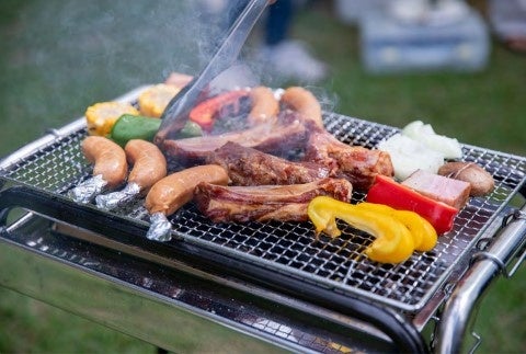 グリル台・テーブル・網・炭・着火剤は会場が準備。気軽にBBQを体験できます。食材は会場内の販売ブースで地元の肉や野菜を購入いただけます。もちろんお持ち込みも可能です。