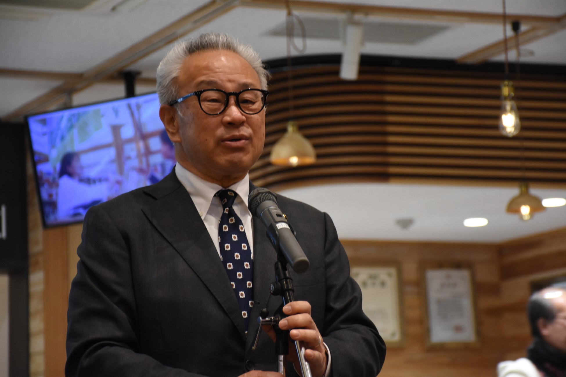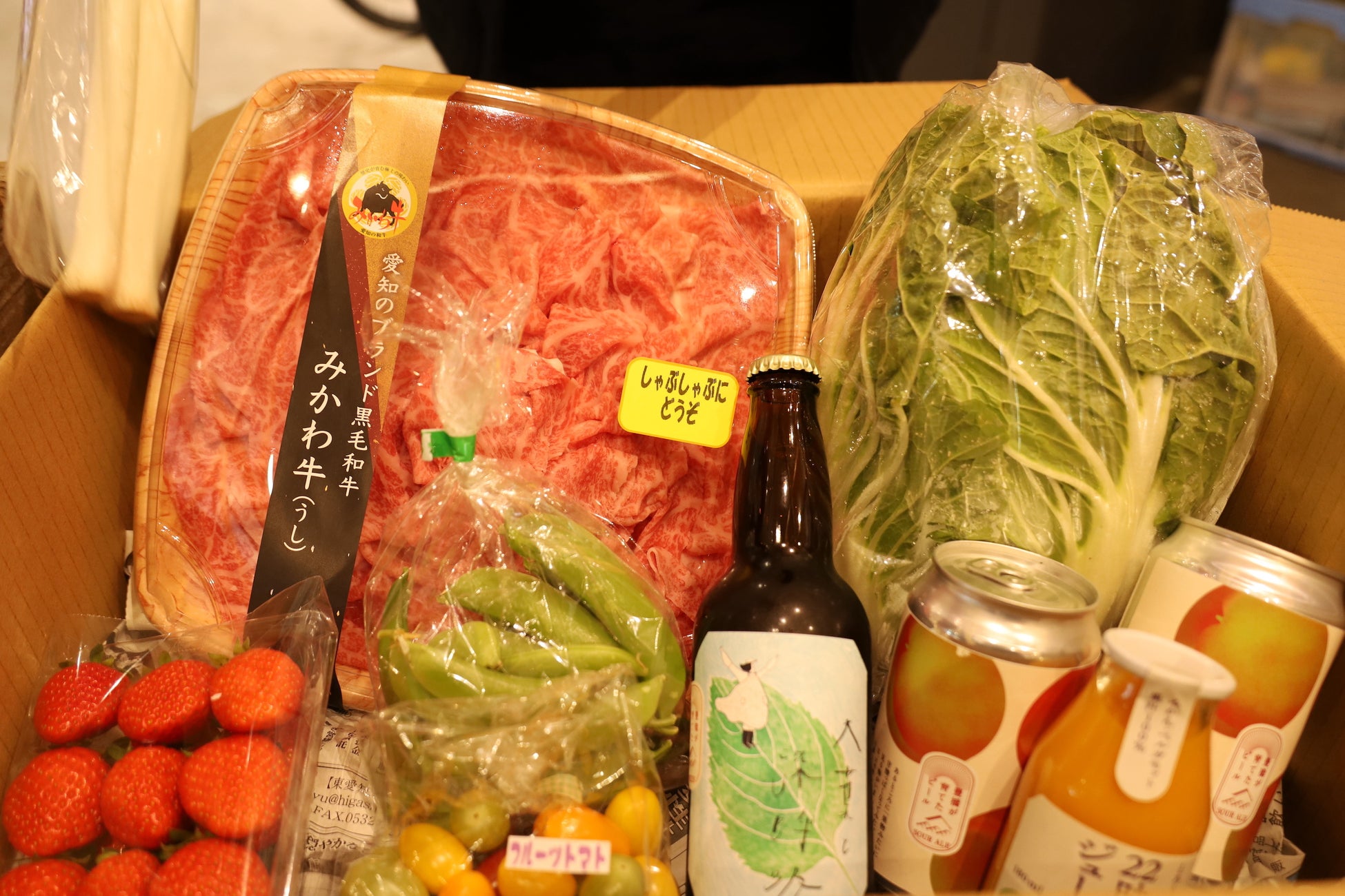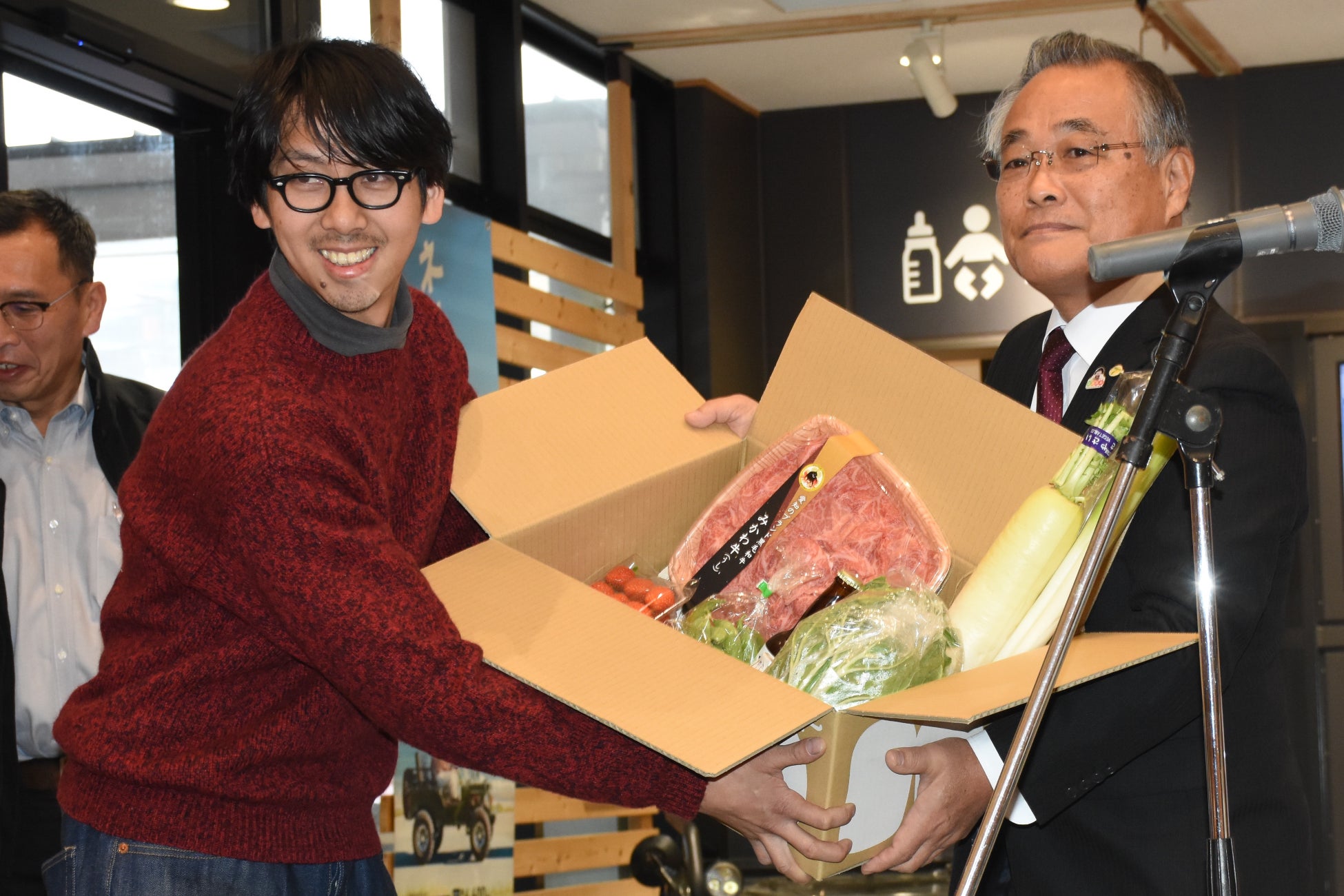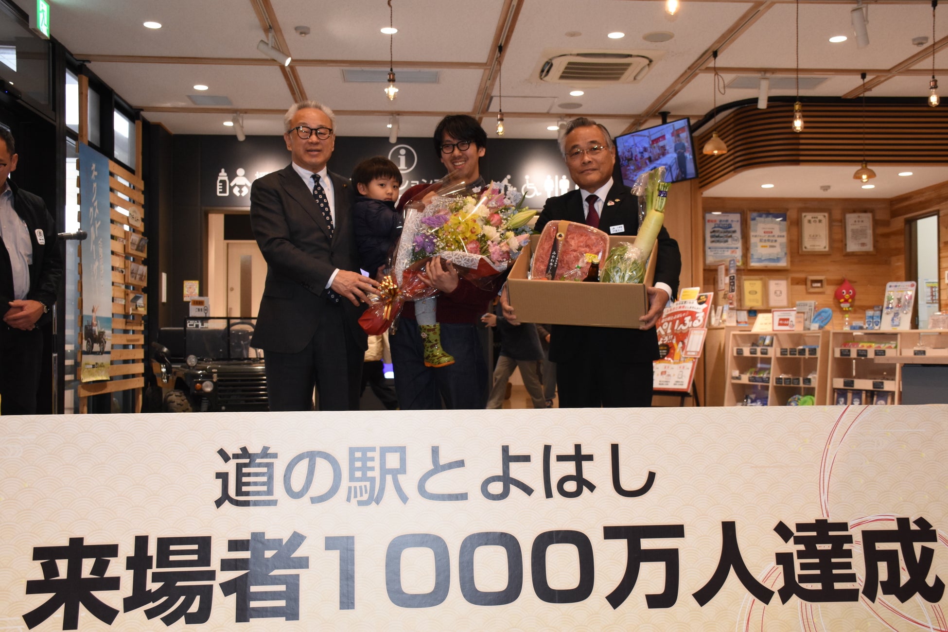 セレモニーで、憲二さんは「(1000万人に選ばれたのは)とても光栄なことで、本当におめでとうございます。これからも地元豊橋の情報発信や、特産品を全国に広げていく拠点としての活躍と発展を願っています」と話しました。2人には、花束と旬のイチゴやミニトマト、白菜、みかわ牛の牛肉、クラフトビールなど地元の名産品が贈られました。
