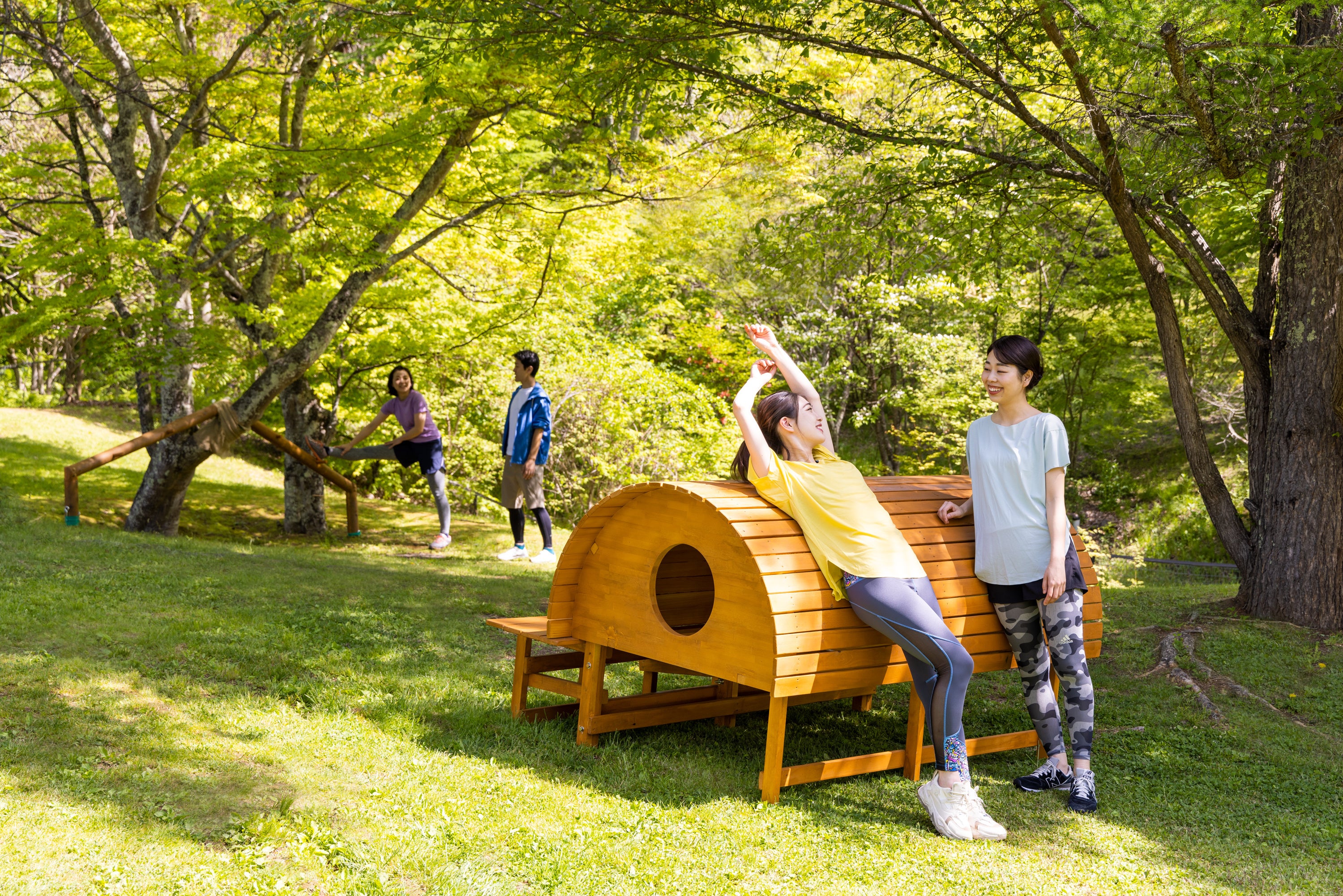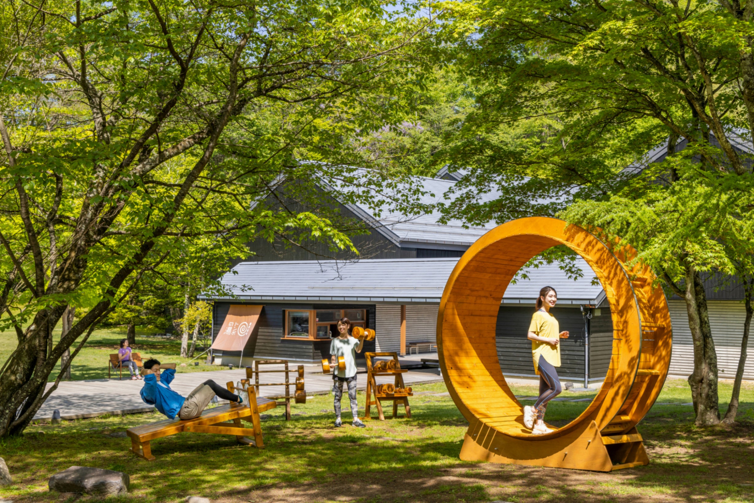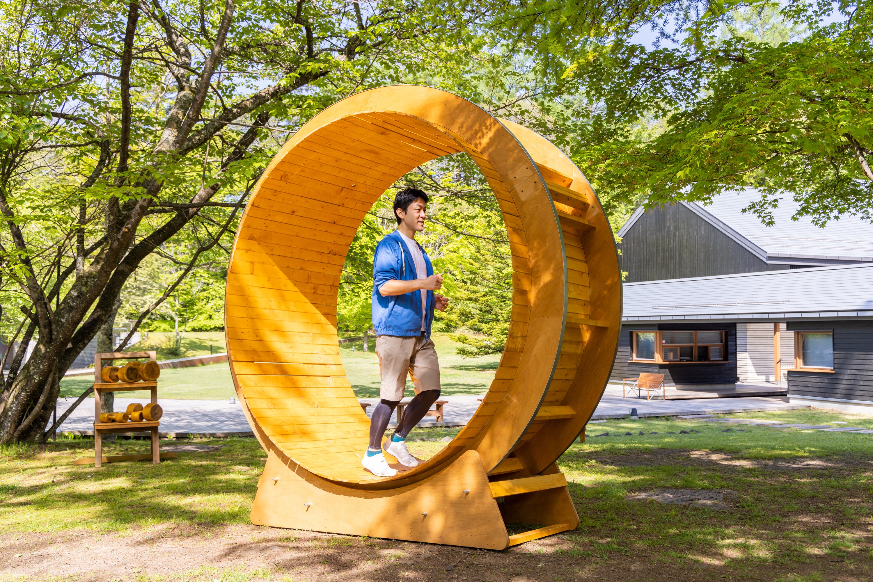 星野エリアに、気軽にリフレッシュできる「軽井沢こもれびジム」が期間限定で設置されます。このジムは、日帰り立ち寄り湯「星野温泉 トンボの湯」の横の丘に、木製のフィットネス器具を配置した開放的なトレーニングスペースです。今年は新たに、風呂桶をイメージした大きな回し車が特徴の木製のウォーキングマシーンを導入します。新緑の中で心地よく運動を楽しむことができます。