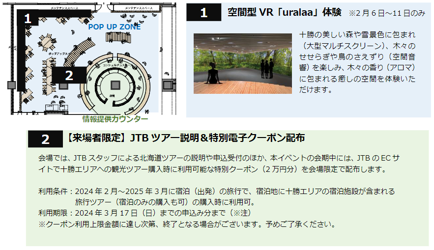 一般の方向けに浦幌町を中心とした十勝観光の魅力をプロモーションし、会場内の空間型VRの有無による訴求力の違いを探るもの。会場ではJTBスタッフによる北海道ツアーの説明や申込受付のほか、旅行ツアー購入サイトの二次元コードやHaNT来場者限定の割引コードも配布。実証期間12日間のうち、前半の①では空間型VR有り、後半の②では空間型VR無しと条件を変え、空間型VRの有無による来場者数、ツアー相談・申込件数等を比較。