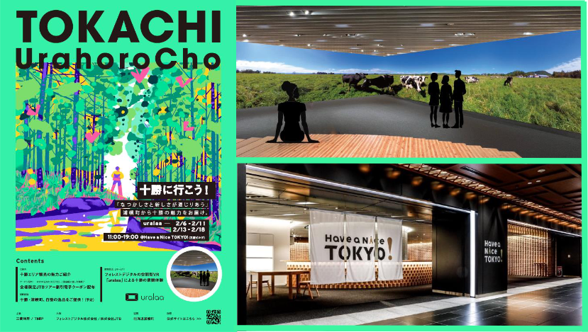 フォレストデジタル株式会社(北海道十勝郡浦幌町、代表取締役CEO:辻木勇二)は、三菱地所株式会社、Tokyo Marunouchi Innovation Platform(TMIP)、株式会社JTB、北海道十勝郡浦幌町と共に、東京・丸の内にいながら空間型VRで十勝・浦幌町の魅力を体感できるイベント「十勝に行こう!『なつかしさと新しさが混じりあう』浦幌町から十勝の魅力をお届け。」を、2月6日(火)~11日(日)、13日(火)~18日(日)の計12日間にわたって開催します。