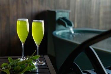 1つ目は、お部屋の新茶。この客室では到着時、就寝前、お目覚め時と、3つのシーンに合わせた新茶を楽しめます。2つ目は、地元の伝統工芸品でもある「遠州綿紬」を使ったお部屋の設え。遠州綿紬を製作するぬくもり工房では、すべての紬の柄に「富士」「利休」「秋茜」などの特徴的な名前がつけられ、柔らかな色合いと縞柄模様が特徴です。ぬくもり工房と界 遠州とで「新茶」柄を共同開発しました。クッションや寝具の一部などにもそのデザインを使用した本プランのお部屋の設えは、色鮮やかで、心安らぐ茶畑の風景を想起させます。3つ目は、新茶の湯上がり「ドラフトティー」。窒素を含ませたクリーミーな泡を付加したビールのような新茶を、お部屋の露天風呂で温まった後の、水分補給に提供します。「ドラフトティー」を通して他にはない贅沢な湯上がりを楽しめる、王道なのにあたらしい新茶体験です。