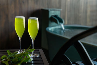 1つ目は、お部屋の新茶。この客室では到着時、就寝前、お目覚め時と、3つのシーンに合わせた新茶を楽しめます。2つ目は、地元の伝統工芸品でもある「遠州綿紬」を使ったお部屋の設え。遠州綿紬を製作するぬくもり工房では、すべての紬の柄に「富士」「利休」「秋茜」などの特徴的な名前がつけられ、柔らかな色合いと縞柄模様が特徴です。ぬくもり工房と界 遠州とで「新茶」柄を共同開発しました。クッションや寝具の一部などにもそのデザインを使用した本プランのお部屋の設えは、色鮮やかで、心安らぐ茶畑の風景を想起させます。3つ目は、新茶の湯上がり「ドラフトティー」。窒素を含ませたクリーミーな泡を付加したビールのような新茶を、お部屋の露天風呂で温まった後の、水分補給に提供します。「ドラフトティー」を通して他にはない贅沢な湯上がりを楽しめる、王道なのにあたらしい新茶体験です。