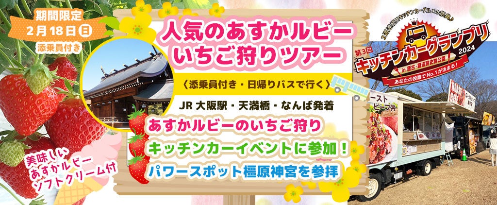 人気商品に付き10席増席致しました!!2月18日(日) お一人様8,500円!【奈良県 橿原・田原本・明日香村】〈大阪駅・天満橋・なんば発着・添乗員付き〉人気のあすかルビーいちご狩り+キッチンカーイベント+橿原神宮参拝!!日帰りバスツアーのオンライン販売を開始しました。