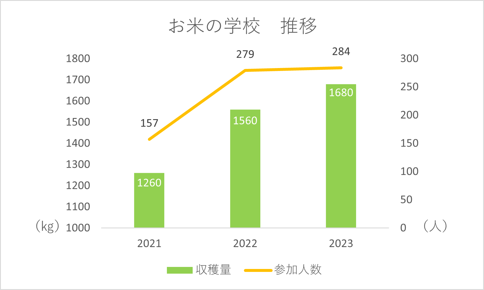 お米の学校は2021年に開始して、今年で4年目を迎えます。お米づくりのノウハウの蓄積と、継続して取り組むことでリピートしてくれる参加者も増え、収穫量と参加者数は年々増加しています。