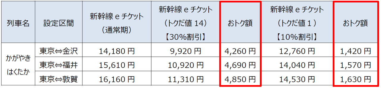 えきねっと会員限定のおトクなきっぷを北陸新幹線にもご用意しております!お早めにご予約いただくことで運賃と料金が割引になる「新幹線eチケット(トクだ値14)」や「新幹線eチケット(トクだ値1)」でおトクにご旅行ください。