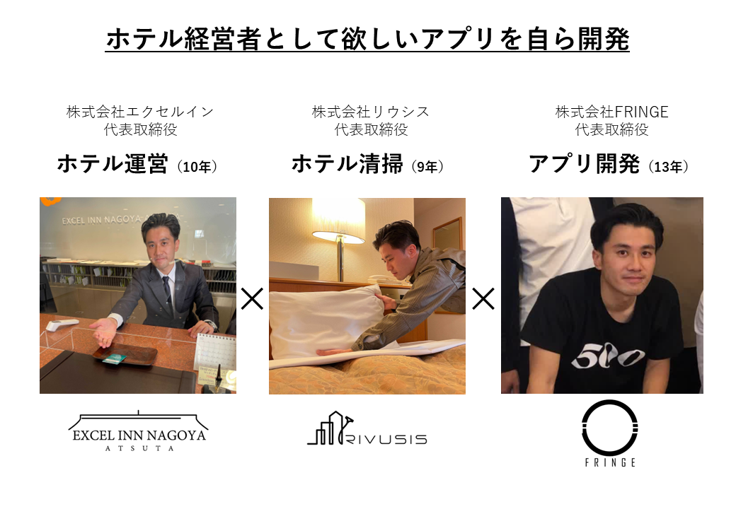 ビジネスホテル(エクセルイン)、ITシステム会社(FRINGE)を営む代表が、2015年6月にホテルを中心とした清掃会社リウシスを立ち上げました。現在、愛知県を中心に13棟のホテルの客室清掃を行っています。
