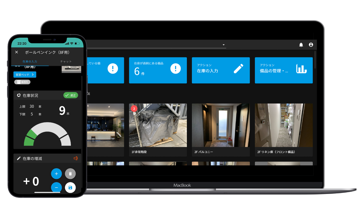 HoteKan備品では、清掃スタッフがアメニティや客室備品の在庫の出し入れをする際にスマホで数量を簡易に入力します。ホテルスタッフが毎月の棚卸をすることなく、在庫数の状況や変動がリモートで分かります。在庫の下限値を下回ると、自動で発注者にメールが飛び、発注忘れが防げます。