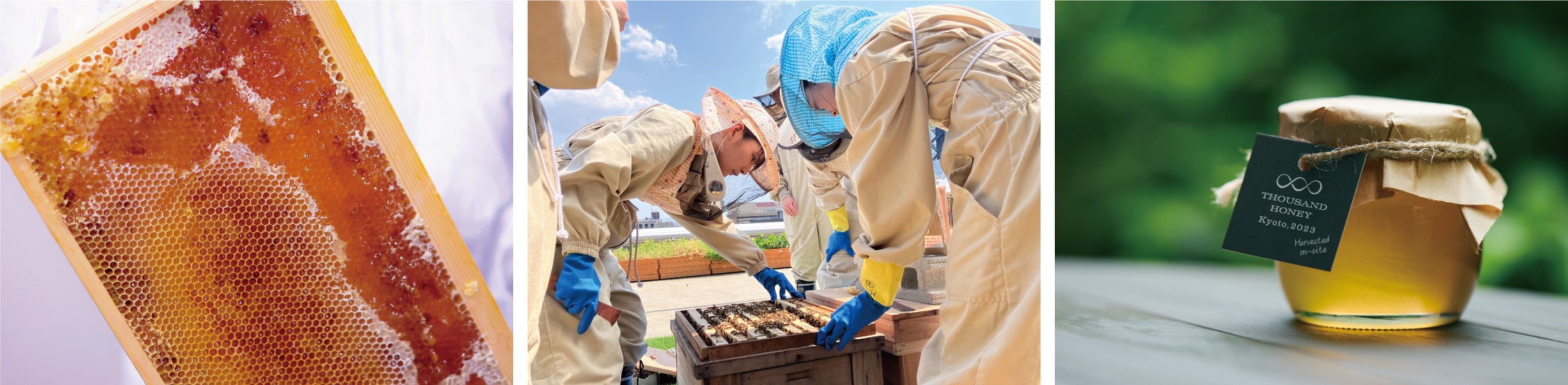 2021年5月にホテル屋上にミツバチの巣箱を設置し、京都のホテルでは初めての取り組みとなる「都市養蜂プロジェクト」を始動。本取り組みは、生物多様性の保全などに一定の役割を果たしている「ミツバチ」をホテル屋上で飼育し、副産物としてのはちみつを採取。ホテルレストランの食材として提供や、瓶詰にして販売する等、地産地消の取り組みも合わせて進めていくものです。