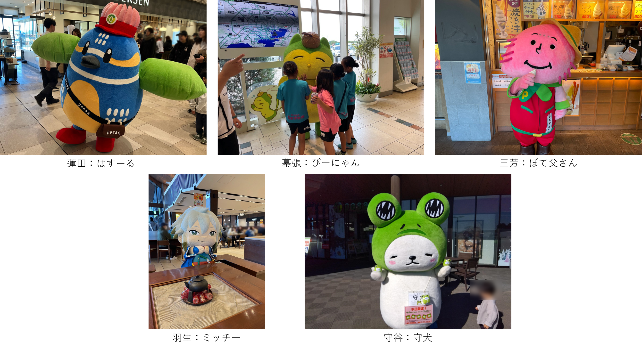 Pasar各施設のキャラクター5体(羽生:ミッチー、三芳:ぽて父さん、幕張:ぴーにゃん、守谷:守犬、蓮田:はすーるが一堂に集結。キャラクター達が「じゃんけん大会」・「撮影会」を実施します。