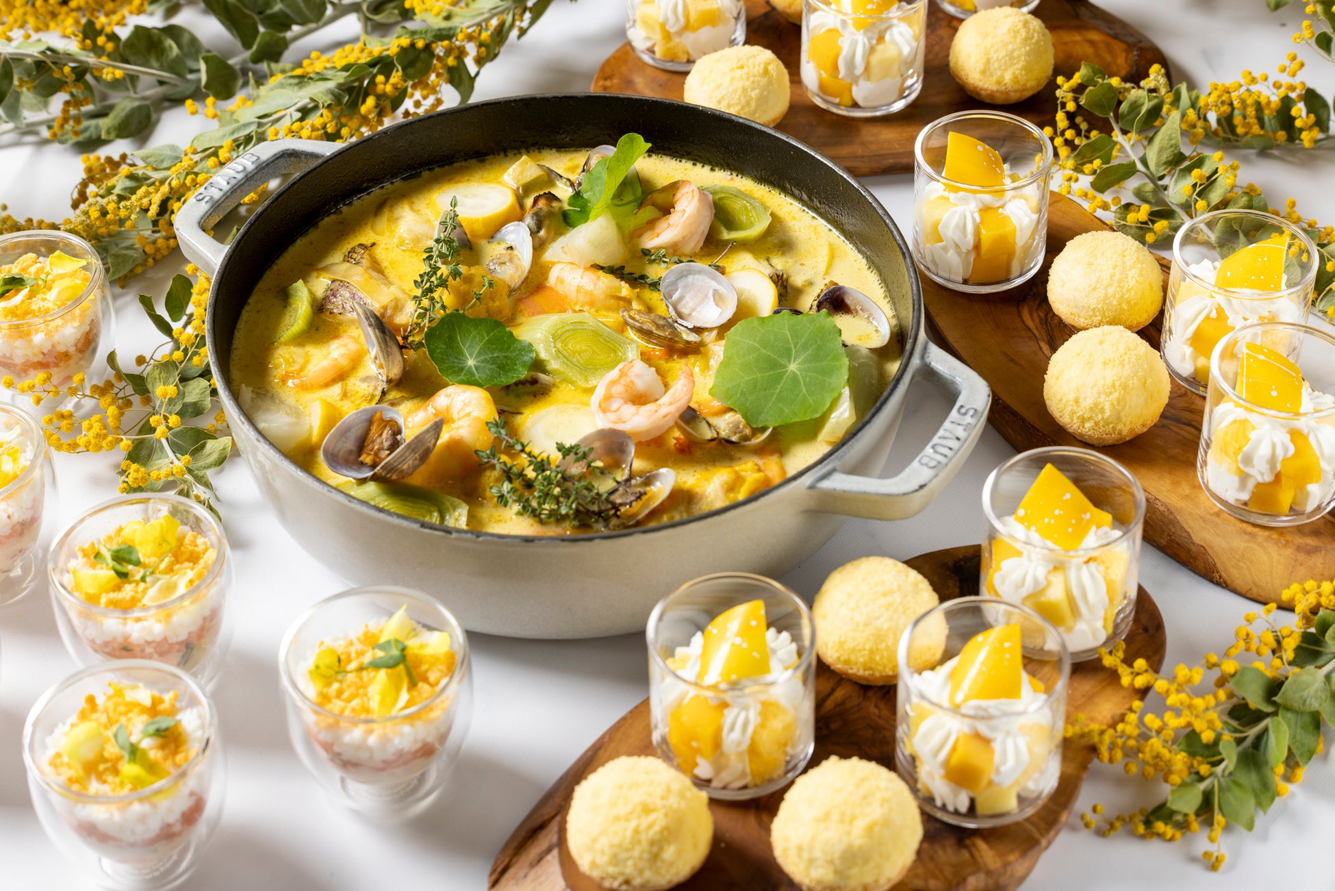 旬のホワイトアスパラガスをミモザサラダ風に仕上げる前菜、サフランが豊かに香る鰆のポワレ、鮮やかな黄色が特長のインカポテトを添えた牛フィレ肉のロースト、優しい酸味が広がるフロマージュブランのムースなど、前菜からデザートまでのすべてのメニューが鮮やかなミモザイエローで彩られた春の訪れも感じられるディナーコースをお楽しみいただけます。さらにランチブッフェでもミモザイエローの特別メニューを4種類ご用意いたします。