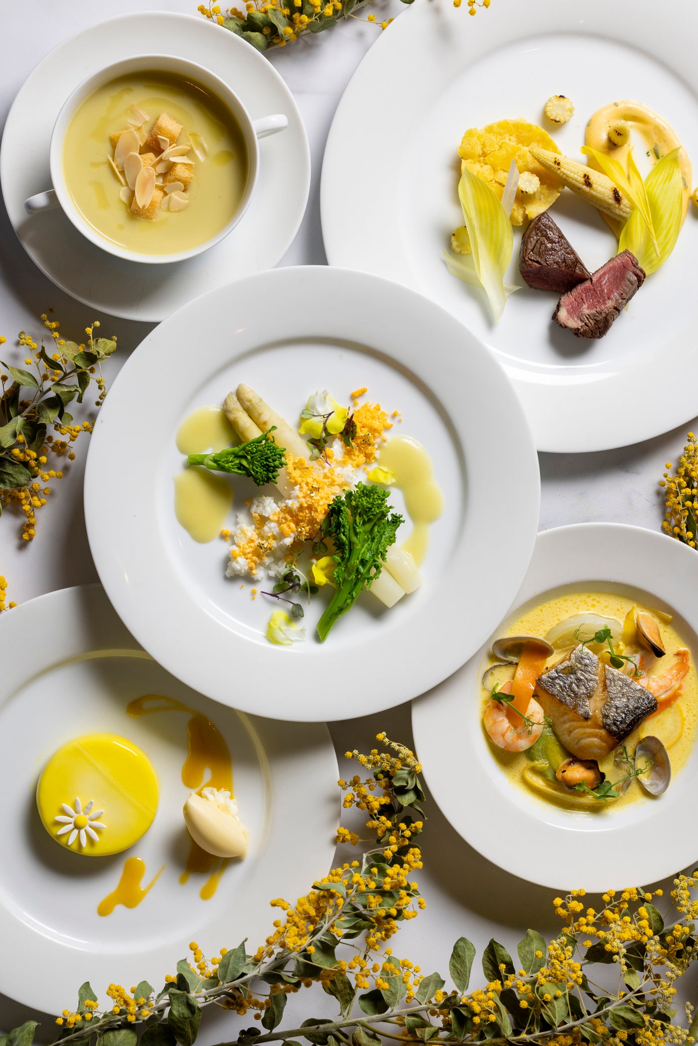旬のホワイトアスパラガスをミモザサラダ風に仕上げる前菜、サフランが豊かに香る鰆のポワレ、鮮やかな黄色が特長のインカポテトを添えた牛フィレ肉のロースト、優しい酸味が広がるフロマージュブランのムースなど、前菜からデザートまでのすべてのメニューが鮮やかなミモザイエローで彩られた春の訪れも感じられるディナーコースをお楽しみいただけます。さらにランチブッフェでもミモザイエローの特別メニューを4種類ご用意いたします。