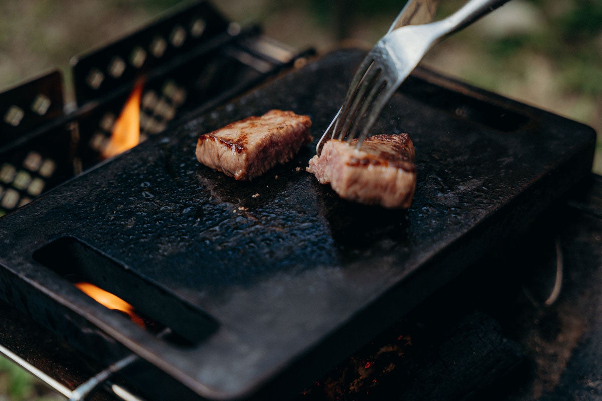 アウトドアで一般に用いられている6mm程度の鉄板にくらべ、異例の厚みをもつ「MAJIN」は、その分蓄熱性能がケタ違いに高く、肉も野菜もおいしく焼けるとアウトドア愛好家たちに高く評価されています。