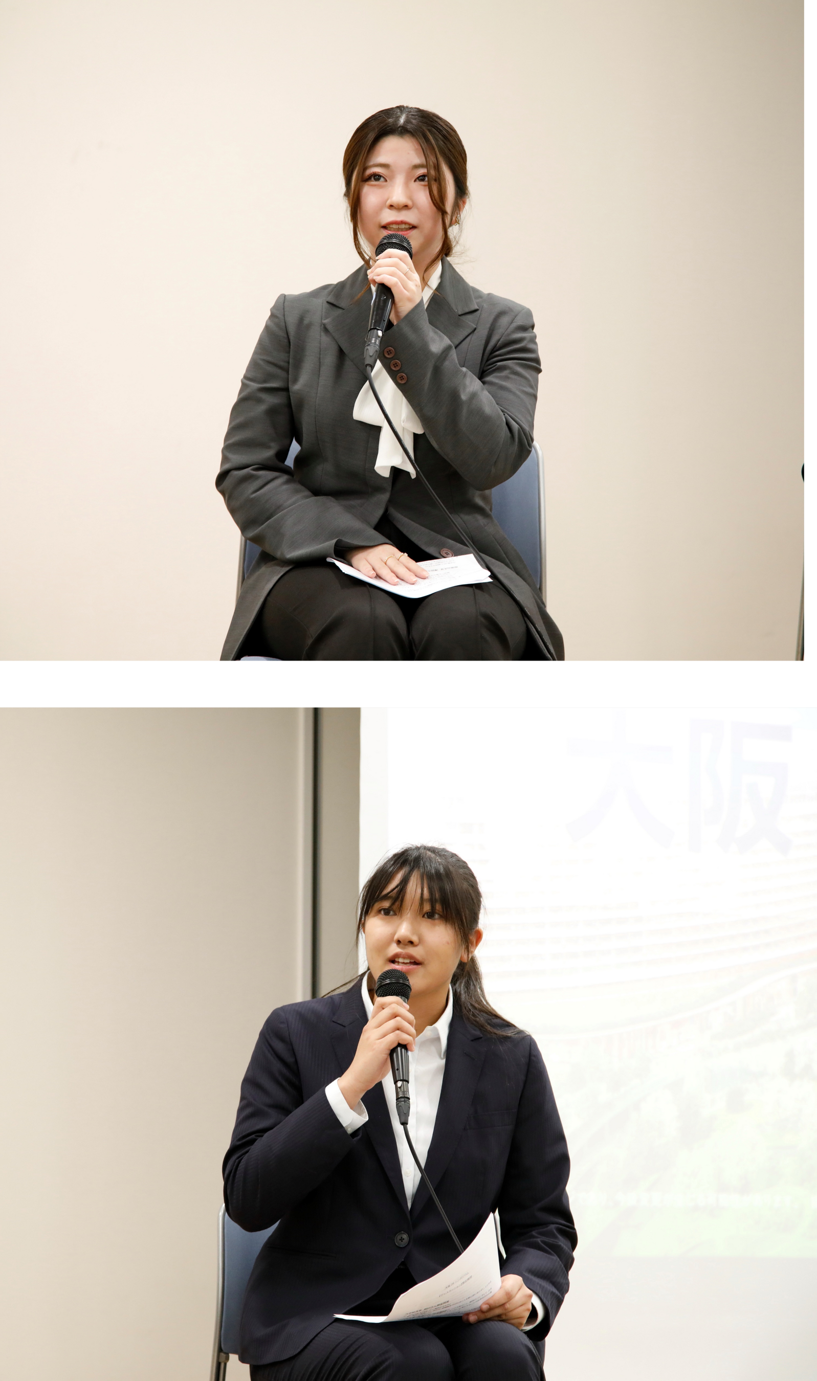 第二部では、『大阪IRをきっかけに大阪・関西をより盛り上げていくためには』をテーマに、ディスカッションを実施しました。講師2名と帝塚山大学(3年生)澤田 茉莉愛さん、大手前大学(2年生)辰巳 麗さんが学生代表として登壇。澤田さんは講演をきいた感想を聞かれると、「大阪から世界が見えるような未来を感じてワクワクしました。」と述べ、IRに期待を膨らませていた様子でした。