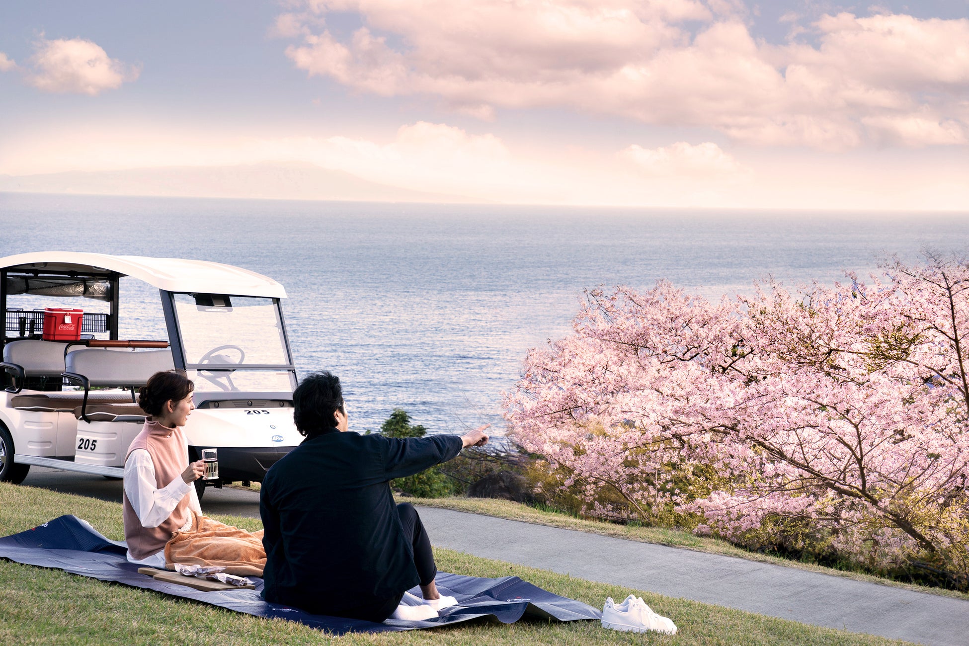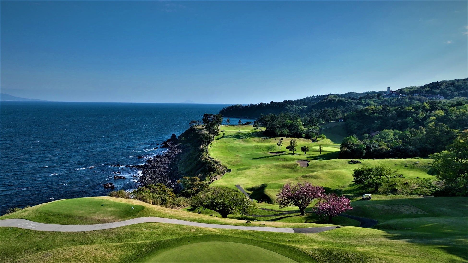 コース内を移動する際は、ガイドが運転する電動ゴルフカートで周遊し、期間に合わせて4月上旬まで咲き誇る様々な桜を見ながら世界的コースの絶景も併せて見ていただける、青い海と様々な桜の色のコントラストが美しい春先取りの体験ツアーです。