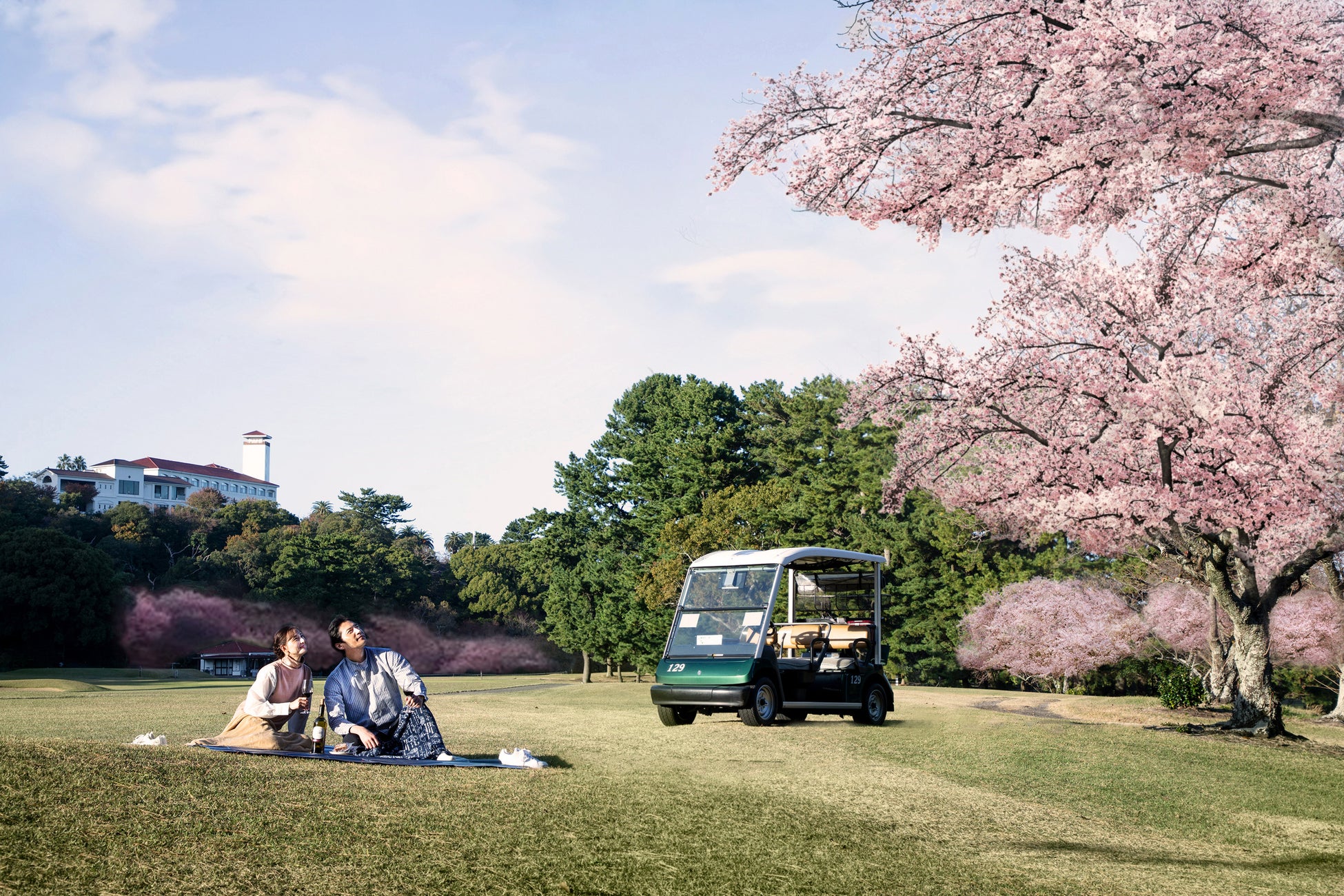 【内 容】夕暮れ時の一番美しい時間にガイドが運転するゴルフカートでコース内を周遊し、敷地内に咲く桜と普段は入ることができない絶景のコースを見て感じてもらうお花見×絶景体験オプションツアーです。