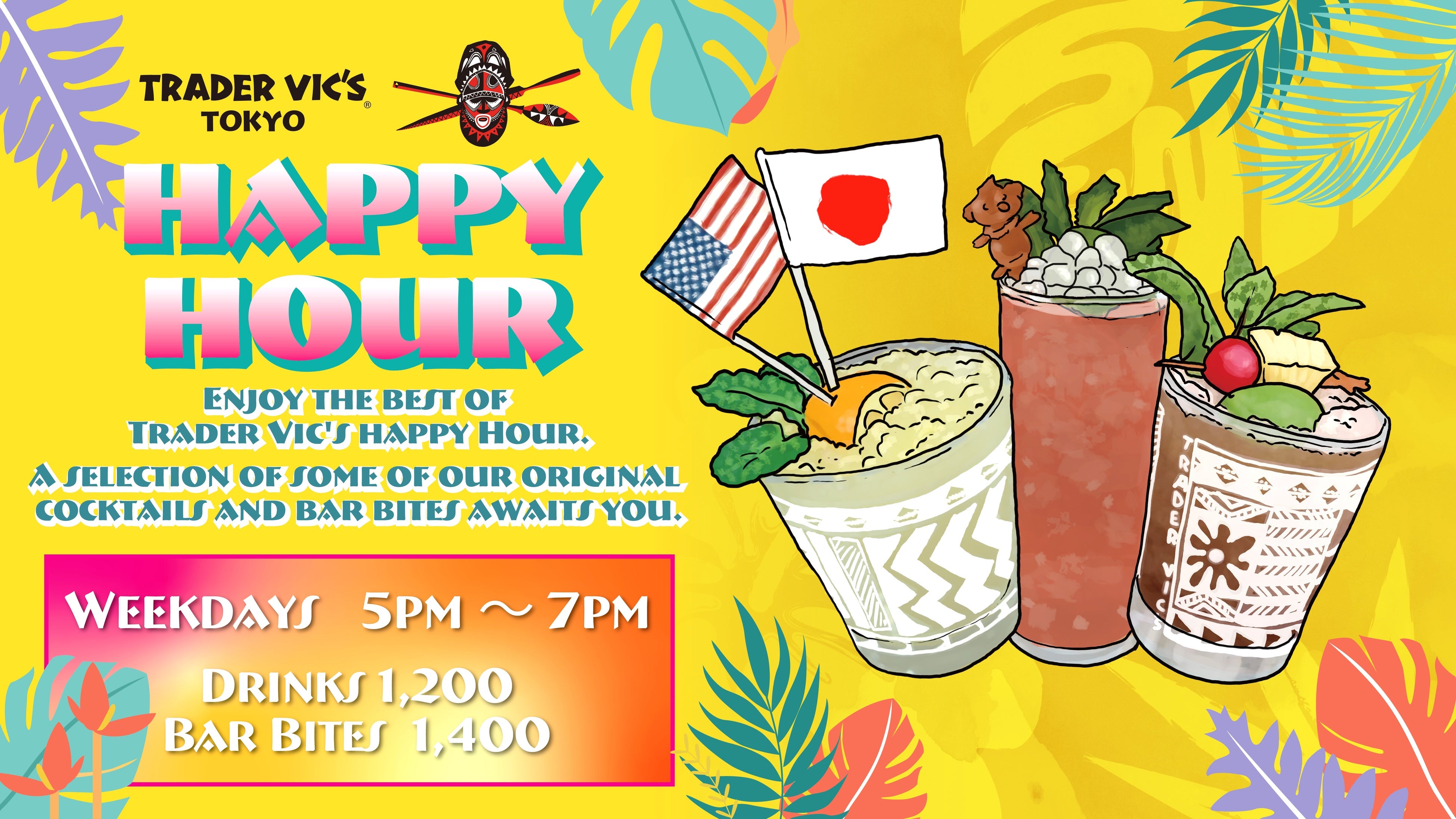 トレーダーヴィックス 東京 ボートハウスバーでは、お得に優雅な時間を過ごしたいという方向けに、平日の17時~19時の2時間限定で、一部メニュー(お食事含む)をリーズナブルな価格でお愉しみいただける「ハッピーアワー」を実施しております。