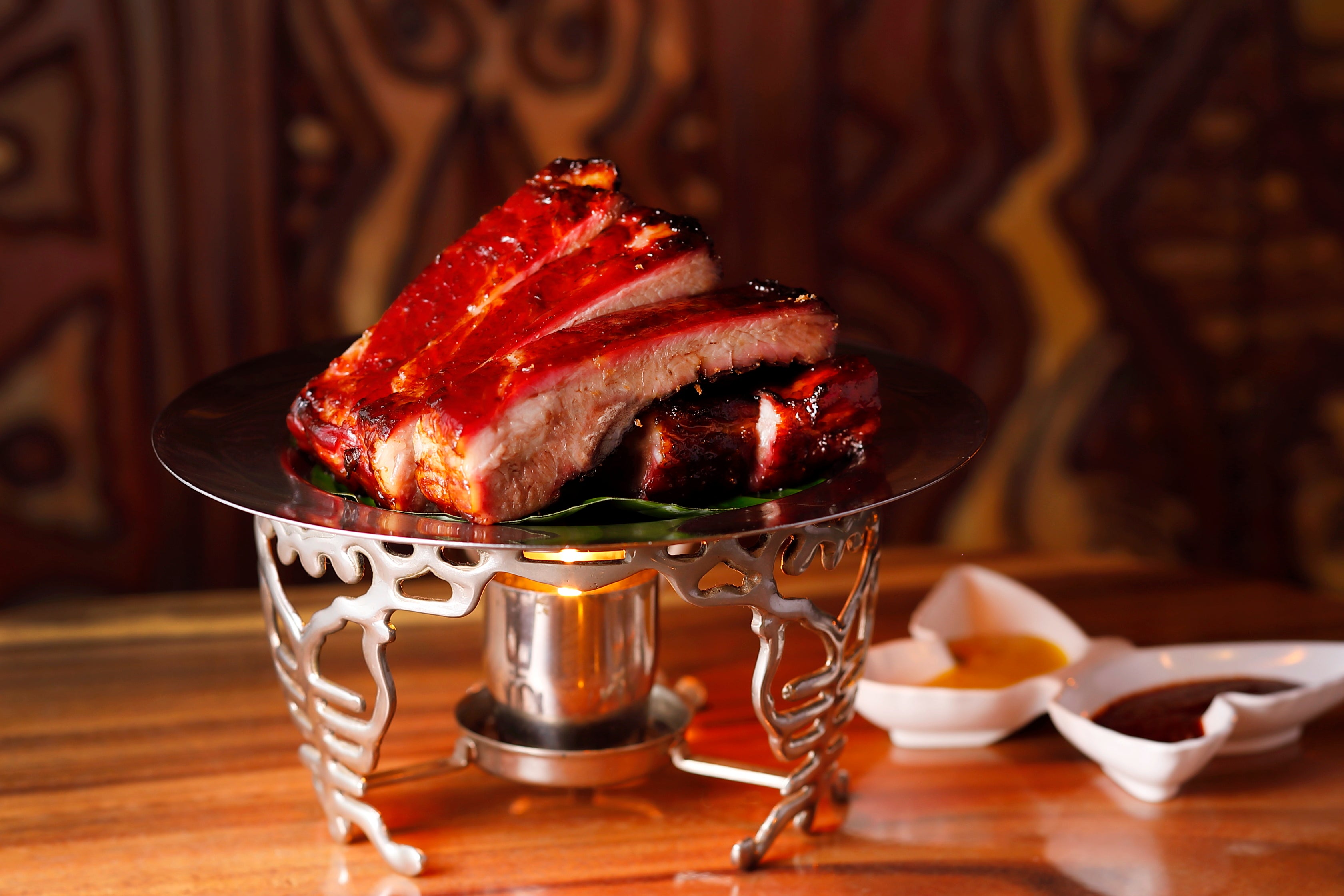 骨付きの豚ばら肉を特製の甘辛ダレにくぐらせ、薪窯で約90分かけてじっくり丁寧に燻し焼きした、トレーダーヴィックスのシグネチャーメニューの1つ。食べ進めるごとに肉本来の旨みがジュワッと口いっぱいに広がります。バーベキューソースとマスタードはお好みで。