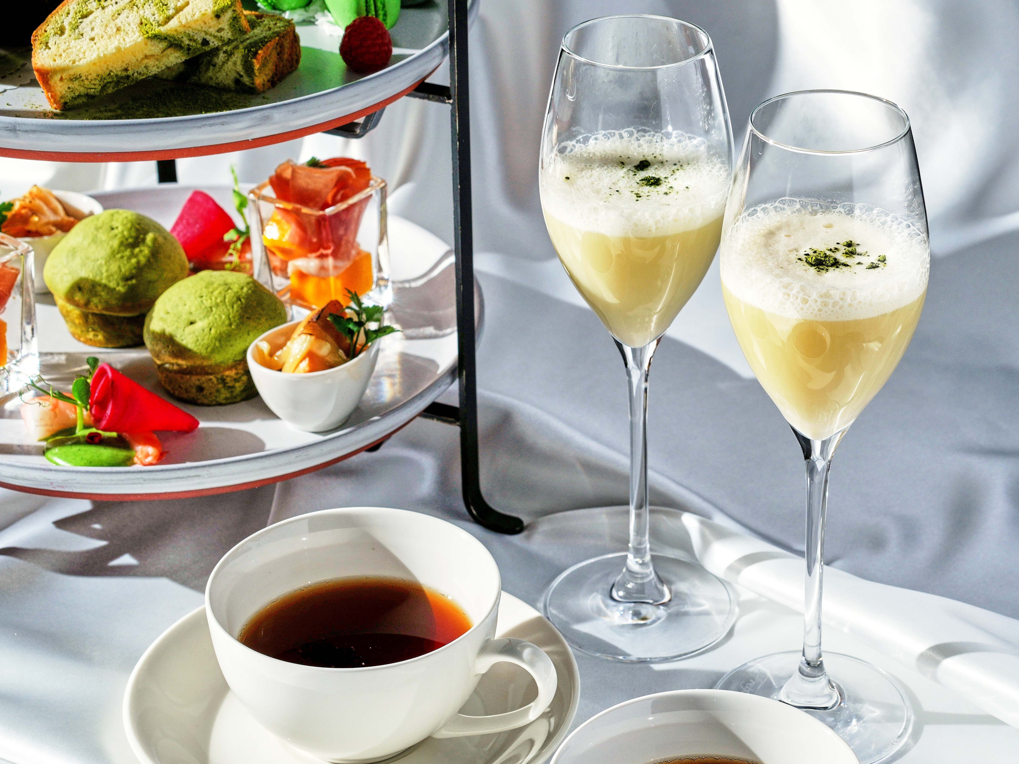 季節ごとにテーマを変えて提供しているアフタヌーンティー。今回は、濃い抹茶とジューシーなマンゴーを使用したメニューに加え、アサリとキャベツのスープ、アスパラとソラマメのフリットなど和をイメージしたウェルカムプレートと、後味のすっきりとした緑茶ラテをウェルカムドリンクにご用意しました。和とトロピカルフルーツが絶妙に調和された、豪華なラインアップで魅了します。