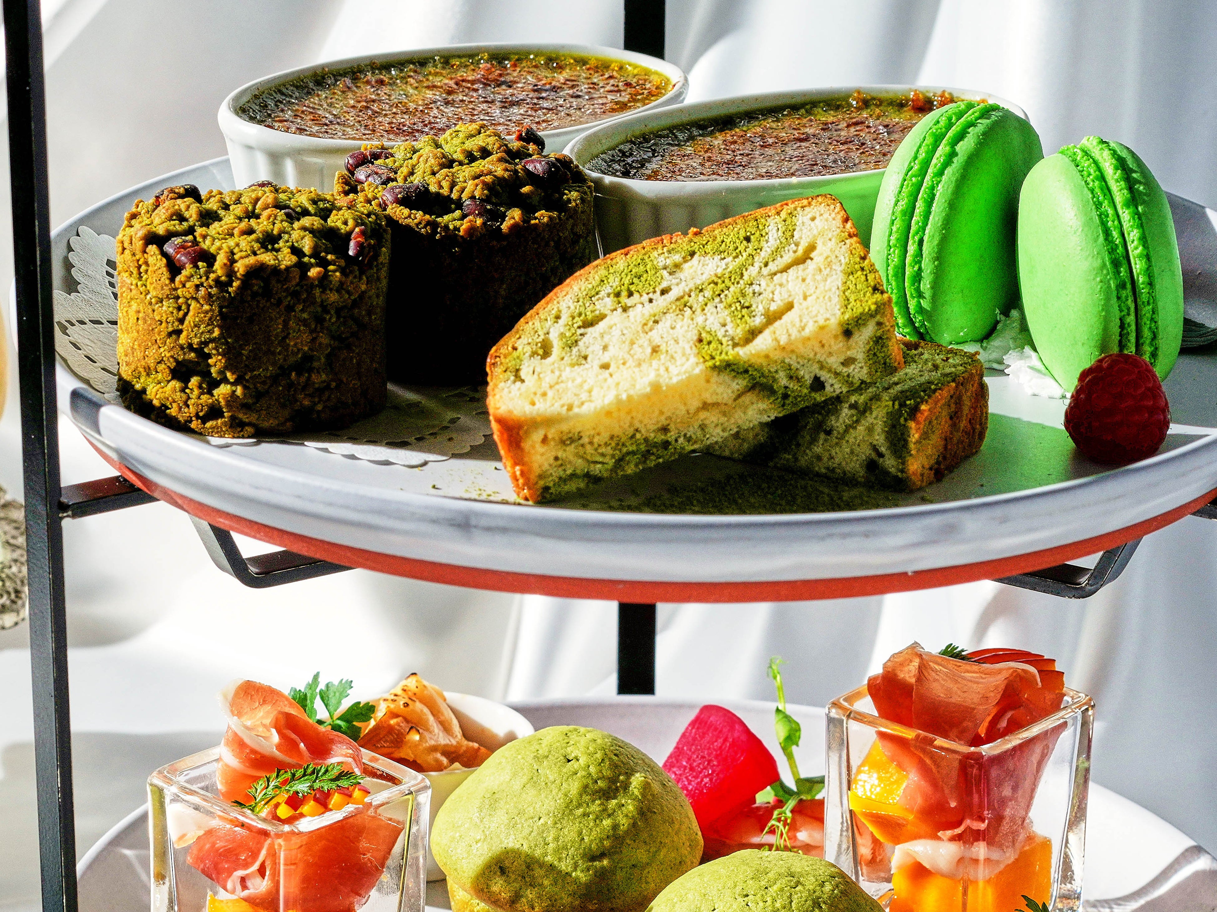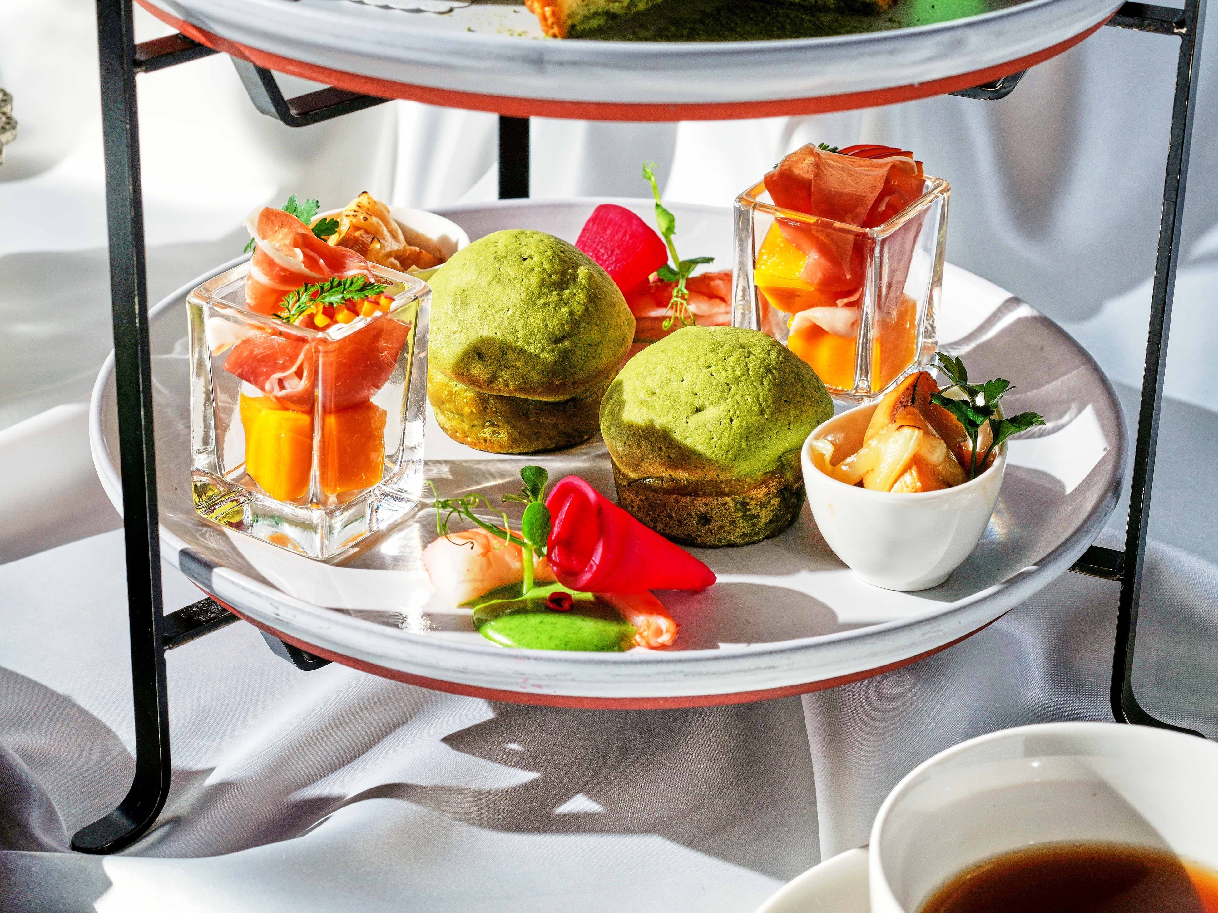 マンゴーが主役の上段には、甘いマンゴーとラズベリーの酸味がマッチしたマンゴームースと、クリーミーさとさわやかさを楽しめるレアチーズケーキにごろっと果肉入りのマンゴーソース添えを。中段には、濃い抹茶を存分に楽しめる抹茶のブリュレや、抹茶と北海道産小豆の和のイメージで作ったほろほろ食感のスコーンと、抹茶尽くしの内容でご用意します。セイボリーは、生ハムの塩味とマンゴーの甘さがマッチしたスペイン産生ハムとマンゴーや、新緑をイメージしたソースで味わうエビのマリネと組み合わせがクセになる一皿に仕上げています。