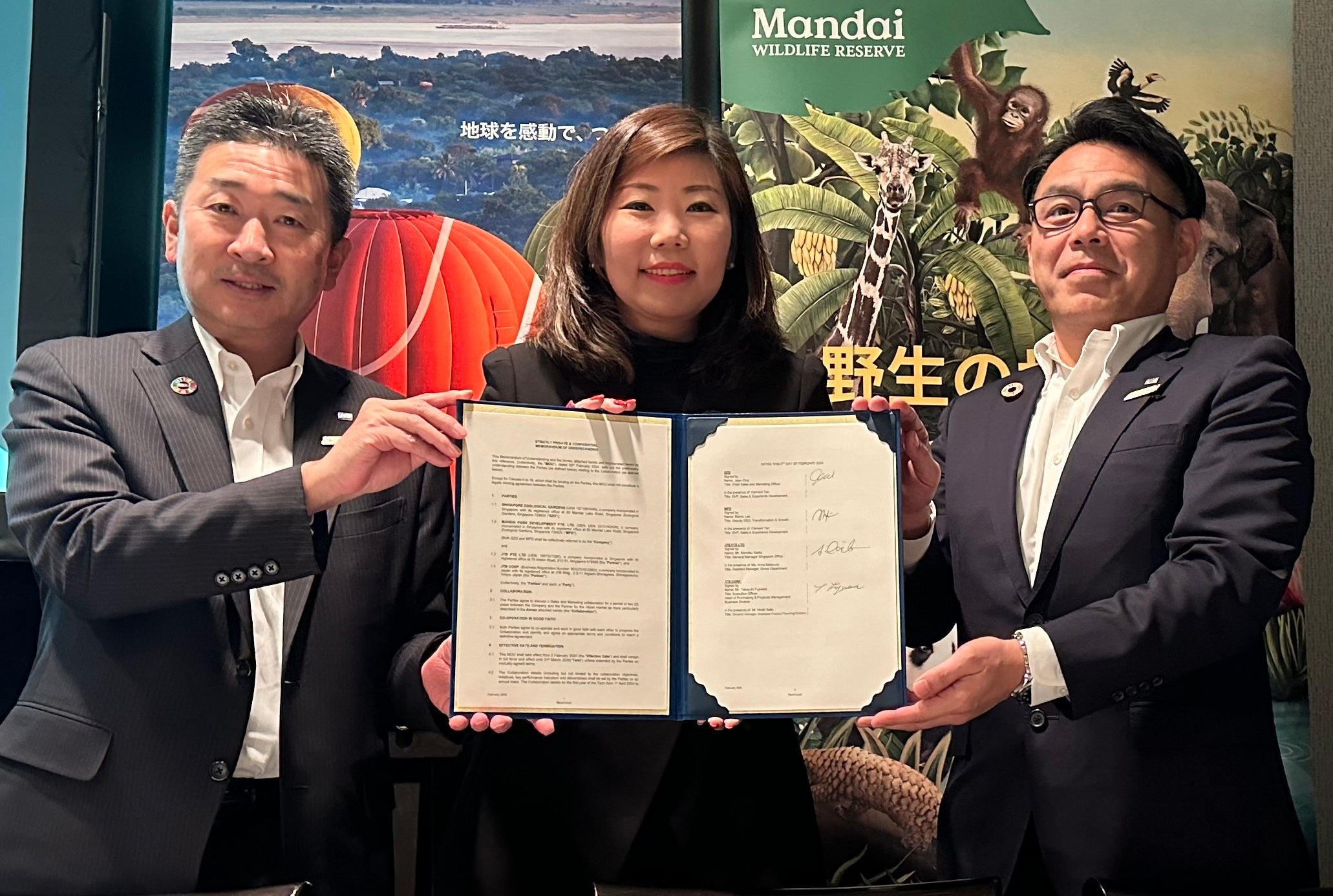 ナイトサファリ、シンガポール動物園、バードパラダイス、リバーワンダーの4つの施設を運営するMandai Wildlife Group(本社:シンガポール、以下「マンダイ・ワイルドライフ・グループ」)と株式会社JTB(本社:東京都品川区、以下「JTB」)、JTB Pte Ltd(本社:シンガポール)の3社は、シンガポール、マンダイ・ワイルドライフ・グループの観光促進とともに、JTBにおけるサステナブル・ツーリズム推進に向け、協力覚書(MOU)を2月5日(月)に締結いたしました。