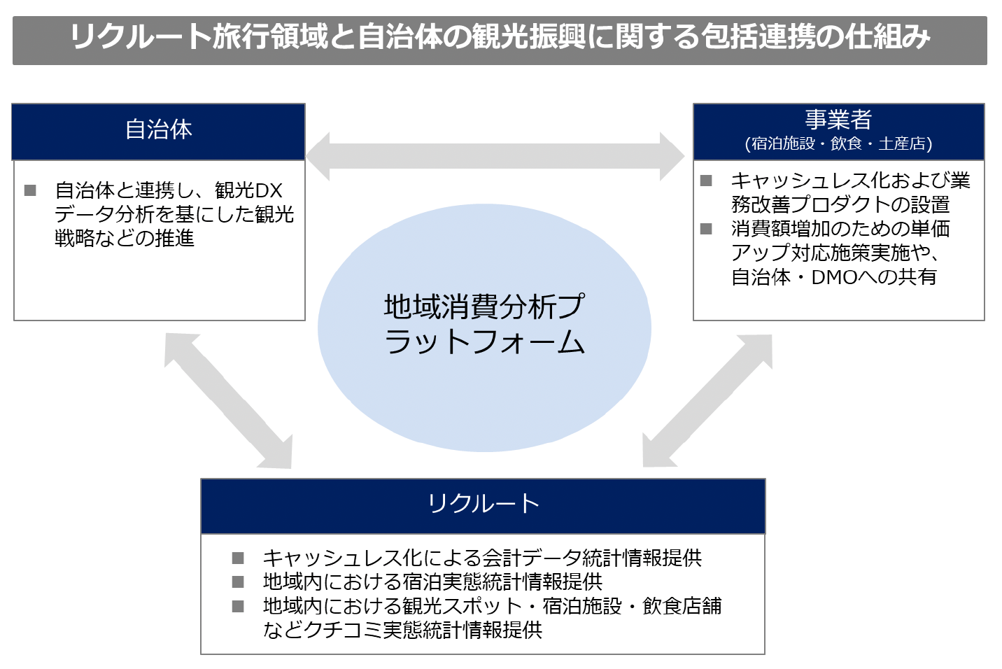 包括連携協定の内容は、観光マーケティング、キャッシュレス促進、観光DX、データを活用した地域経営推進、観光商品開発と情報発信、人材育成など多岐に渡ります。まず決定している取り組みとして、リクルートが提供する業務・経営支援サービス「Air ビジネスツールズ」を活用した、地域消費分析プラットフォームの構築を実施してまいります。