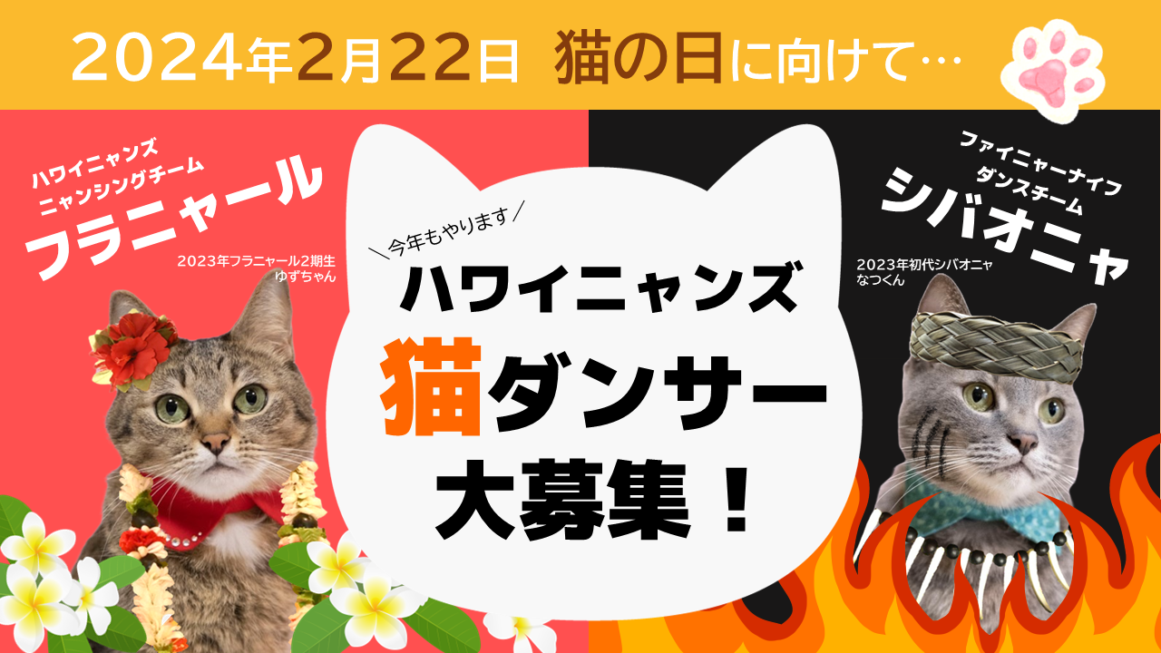 また、みなさまの大切な愛猫の画像を募集し「ハワイニャンズ・ニャンシングチーム」、「ファイヤーニャイフダンサー”シバオニャ”」も結成します。『猫の日』当日には、猫ダンサーの画像とプロフィールを掲載した「猫ダンサーオールスター名鑑」を、公式ホームページとハワイアンズ館内に掲出します。「猫ダンサーオールスター名鑑」は2022年からスタートし、今年の「フラニャール」は3期目となります。ハワイアンズ館内での掲出は今年が初めてとなります。